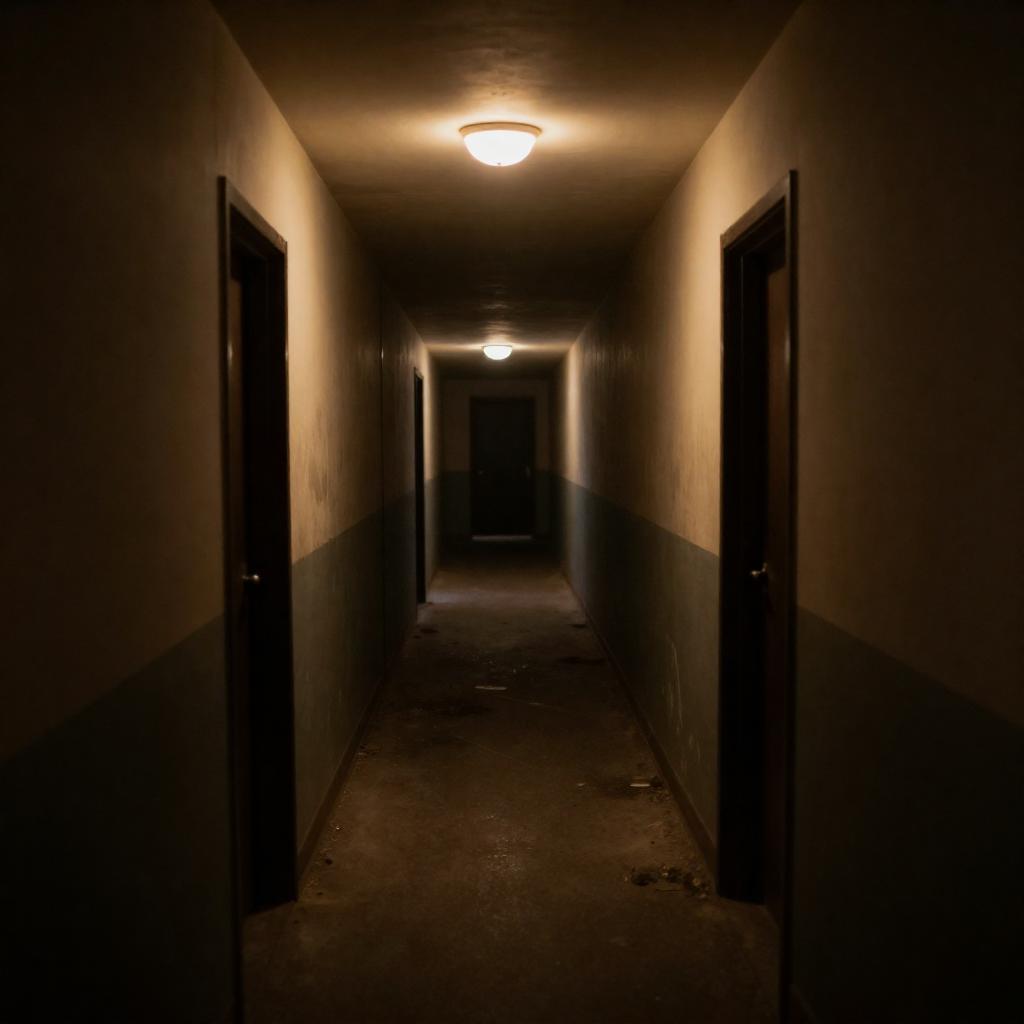 Photograph of a dimly lit, narrow, and dirty hallway with yellowish overhead lights. The walls are worn and dark brown, with scattered debris on the floor. Two doors are on either side, leading to dark, shadowy rooms. The perspective creates a sense of depth, focusing on the distant, illuminated doorway at the end.