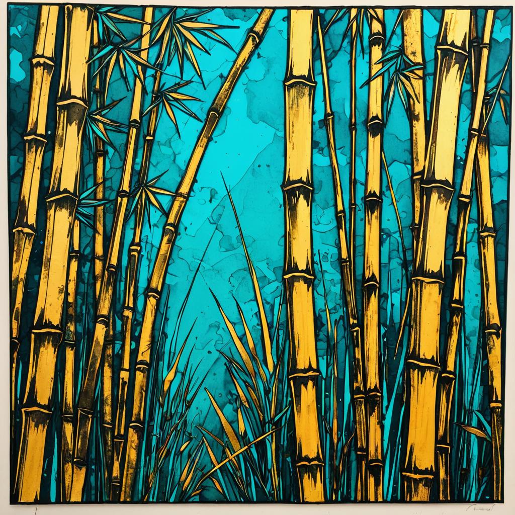 Line art drawing featuring bamboo silhouette with intricate foliage details rendered in alcohol ink. The artwork uses vibrant day-glo accents in shiny gold against electric teal hues, creating a striking contrast and a breathtaking visual effect.