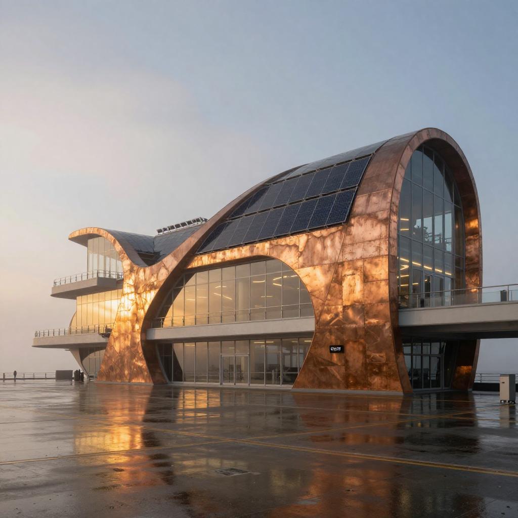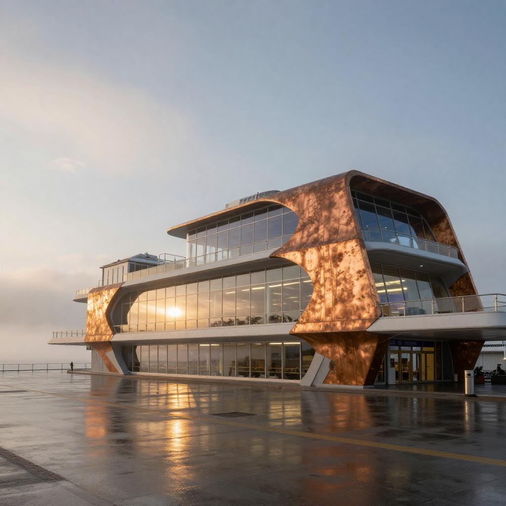 RAW photo, futuristic coastal ferry terminal with layered terraces, cantilevered platforms and wide glass façades, frontal elevation, neo-parametric timber lattice fused with weathered copper cladding and photovoltaic glass, organic curves with exposed structural ribs, dawn golden-hour mist with low sea fog, warm interior glow, pale dramatic clouds, wet paving reflections and soft sunbeams, open plaza foreground, architecture photography, hyper realistic, super detailed, 8k, Nikon Z9, 14mm ultra-wide, tripod, tilt-shift correction, long exposure, true verticals, clean lines, sharp reflections, calibrated white balance, subtle film grain, HDR bracketed, crisp edges, minimal signage