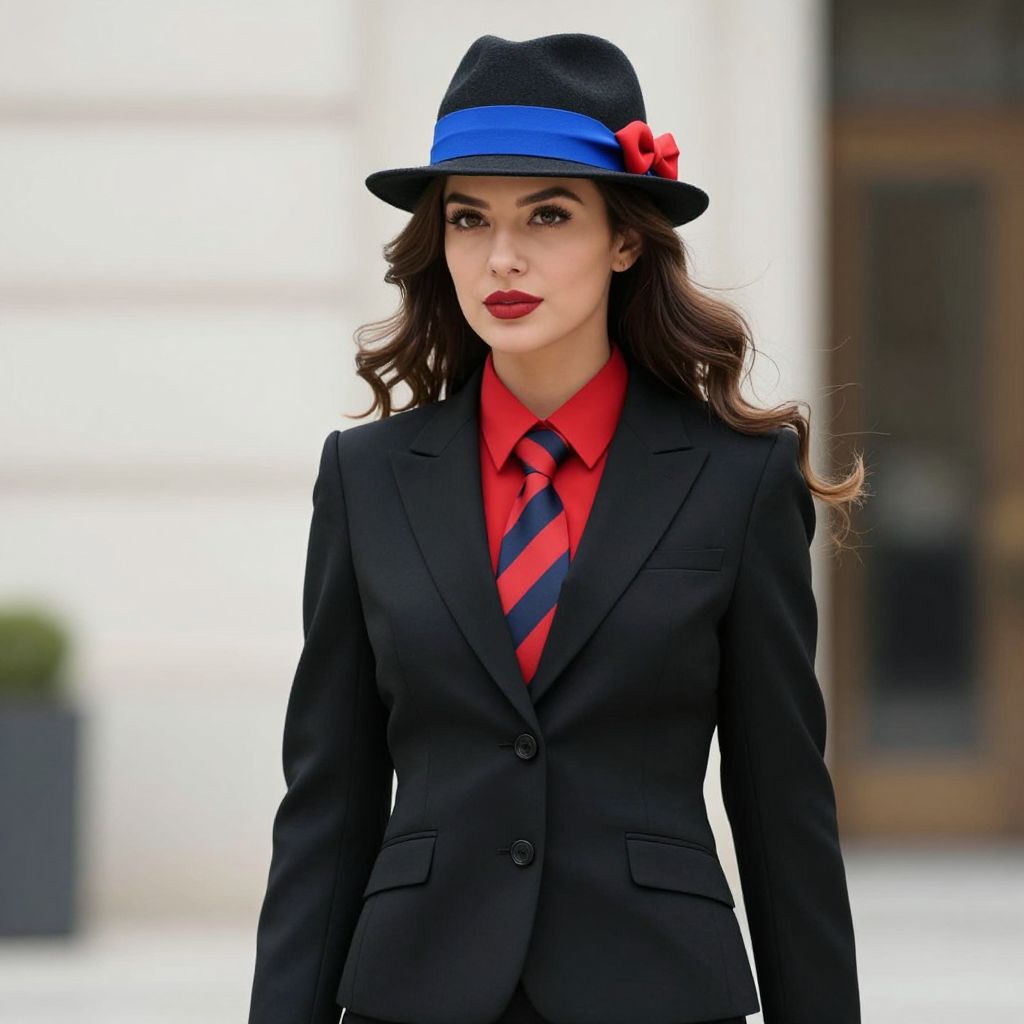 A confident woman with long, flowing brown hair styled in soft waves, wearing a sophisticated black suit with a crisp red shirt and a bold striped tie. She wears a stylish fedora-style hat adorned with a bright blue ribbon and a red bow, giving her a polished and elegant look. The scene is set in a modern urban setting with soft natural lighting, highlighting her refined appearance and poised demeanor.