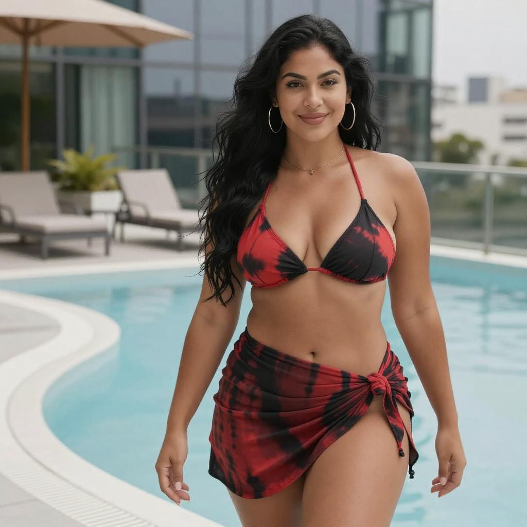 Photograph of a young woman with long dark hair, wearing glasses, a tight red t-shirt, and a short plaid skirt, standing beside a red vintage car on a wet, cobblestone street. She smiles confidently, with one hand on her hip, and the car's front grille and round headlight are visible in the background.