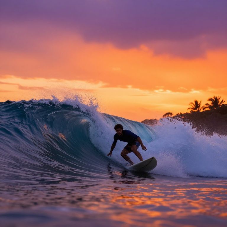 Surfers catching a giant wave at sunset, vivid orange and purple sky, detailed water splashes, dynamic poses, tropical beach in the background, photorealistic style, cinematic lighting, high resolution