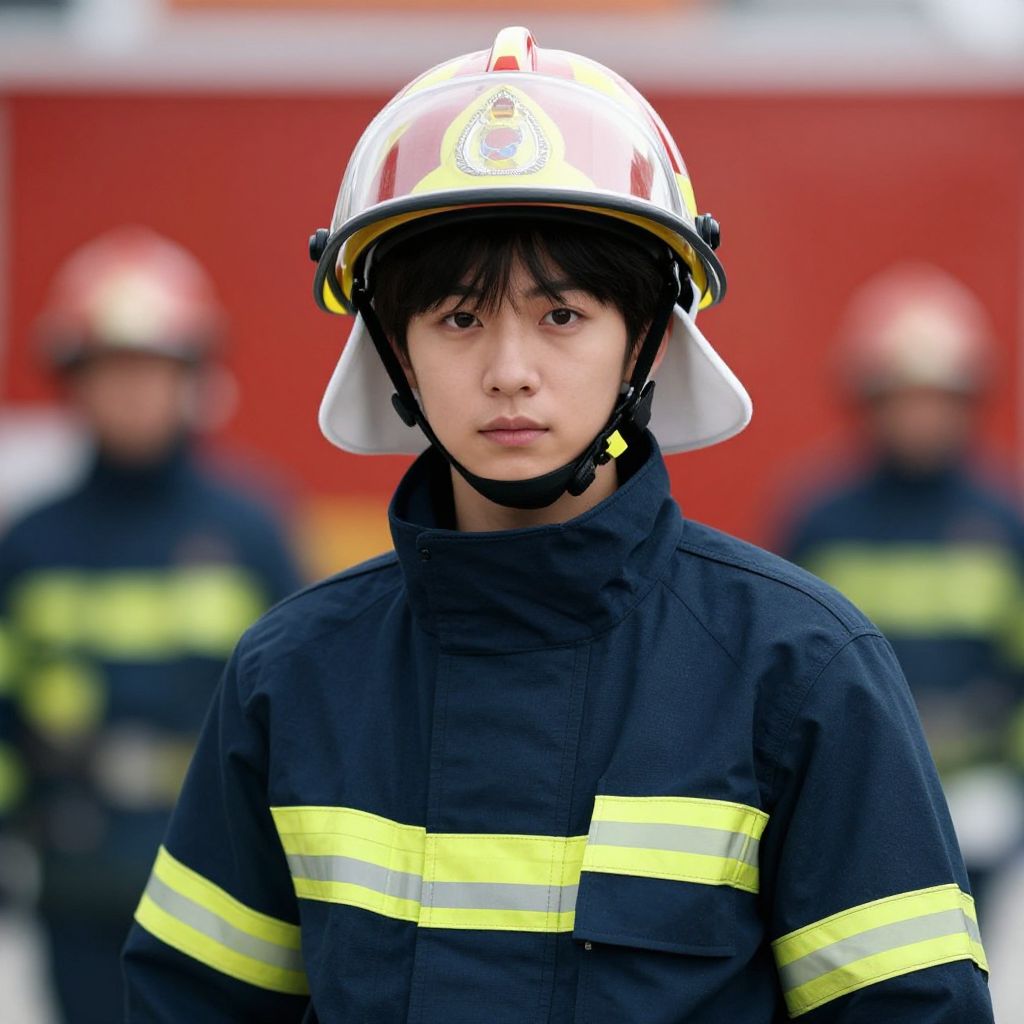 Photograph of a young Asian male firefighter in the foreground, wearing a white helmet with a yellow emblem, black uniform with yellow reflective stripes, and a serious expression. He has straight black hair peeking from under the helmet. In the blurred background, two other firefighters in similar uniforms and red helmets stand against a red fire truck. The image has a sharp focus on the front firefighter, with a shallow depth of field blurring the background. The lighting is natural, highlighting the firefighter's face and uniform details.