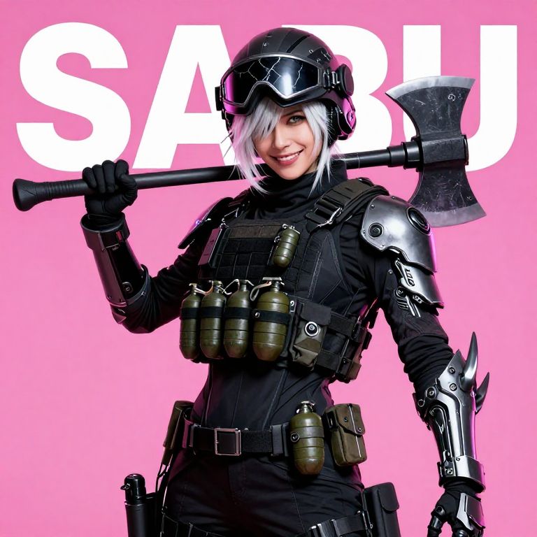 R3alisticF, G0thicL1nes,A fierce and confident female character in heavy tactical gear with an armored helmet and a cracked visor revealing a sly grin and one visible eye, Her short, messy white hair adds to her rebellious look, and she wields a large fire axe over her shoulder, Her outfit is highly detailed, featuring various tactical pouches, grenades, and equipment strapped across her chest, arms, and waist, Mechanical, claw-like armor on her left arm adds a menacing touch, blending elements of military and sci-fi aesthetics, The vibrant pink background contrasts with her dark attire, highlighting her as the main focus of the composition, The words 'SABU' are visible in bold white letters behind her, enhancing the edgy and dynamic feel