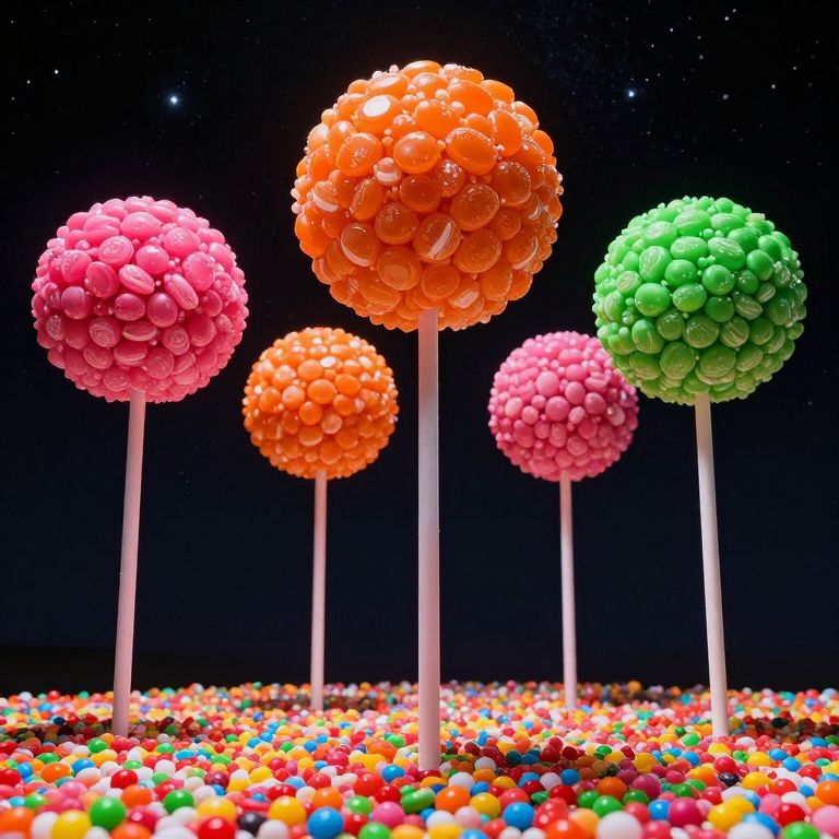 Lollipop-like trees with vibrant pink, orange, and green spherical canopies stand tall against a starry night sky, their slender trunks reaching down to a colorful carpet of scattered candy pieces below.