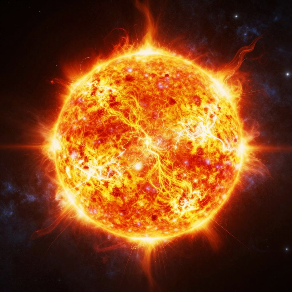 Sunfire erupting from a celestial orb floating in space, radiating intense solar flares and plasma streams, luminous yellow and flaming red hues against a star-studded cosmic background, high-detail sci-fi illustration with glowing energy effects.