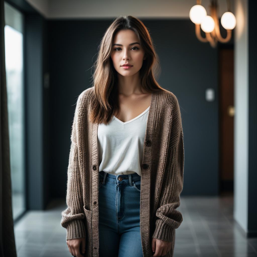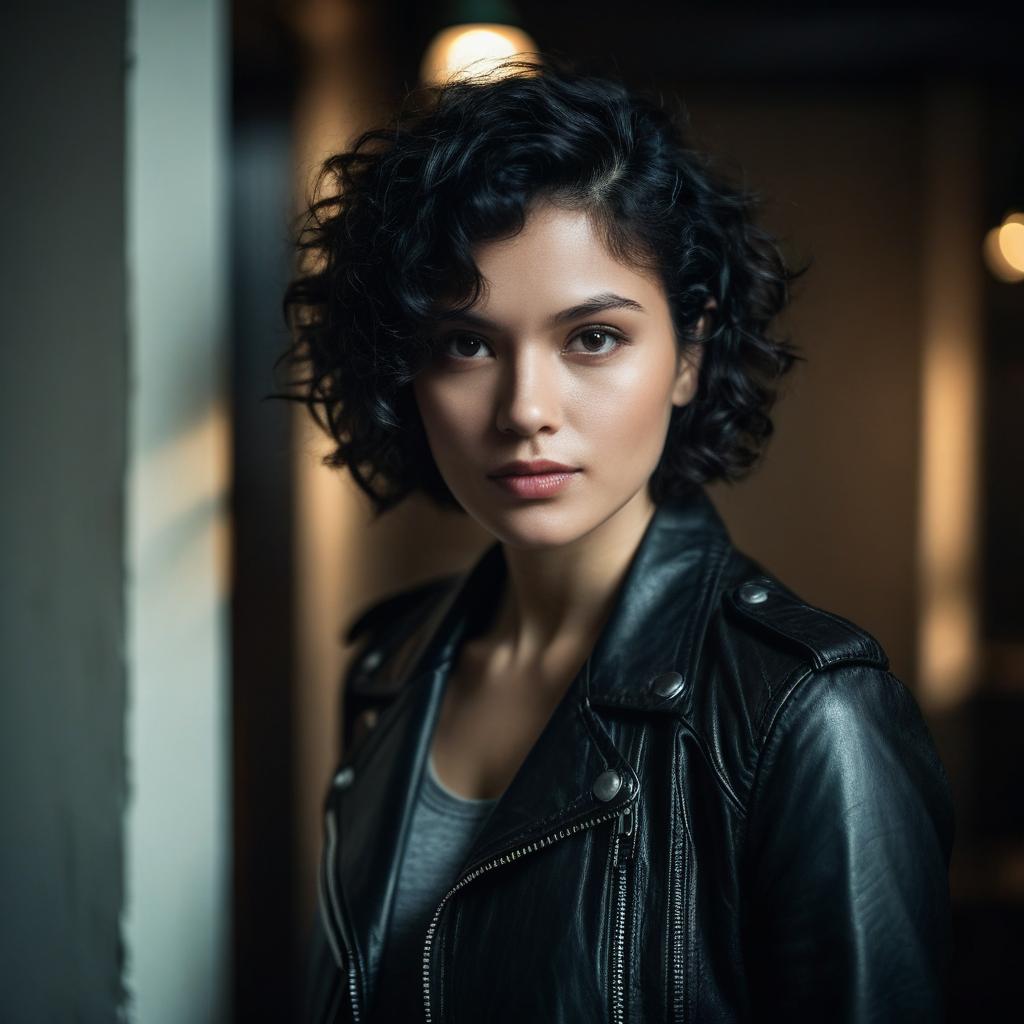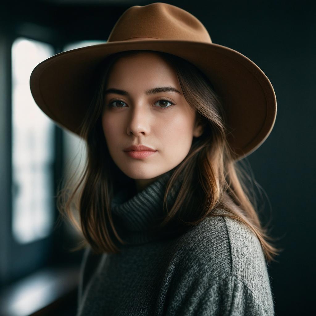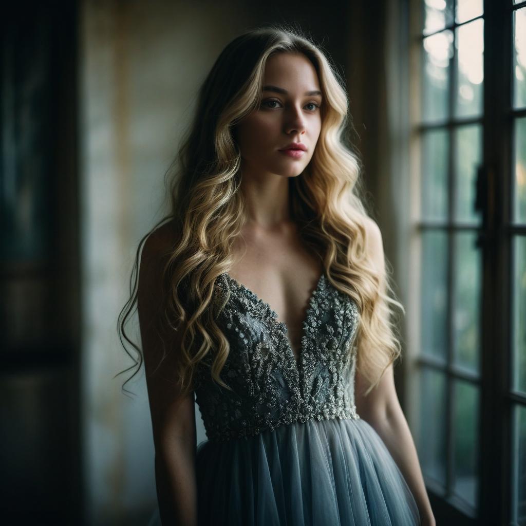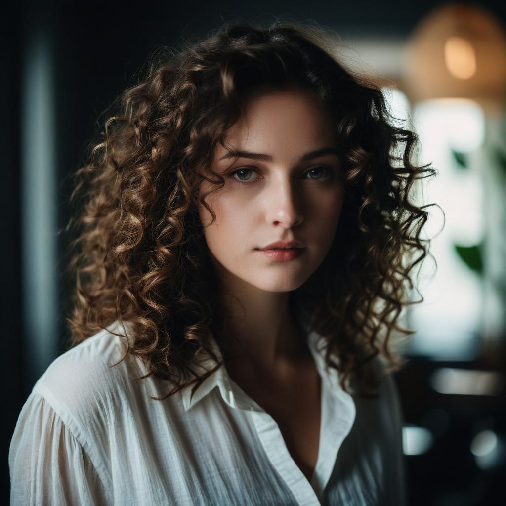 A portrait of a young woman with wavy auburn hair and natural makeup, wearing a red & white patterned dress, standing in an indoor setting with soft moody lighting and deep shadows, realistic photography style with cool and muted colors, soft focus and cinematic atmosphere