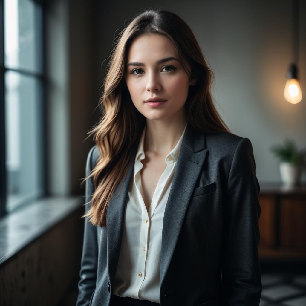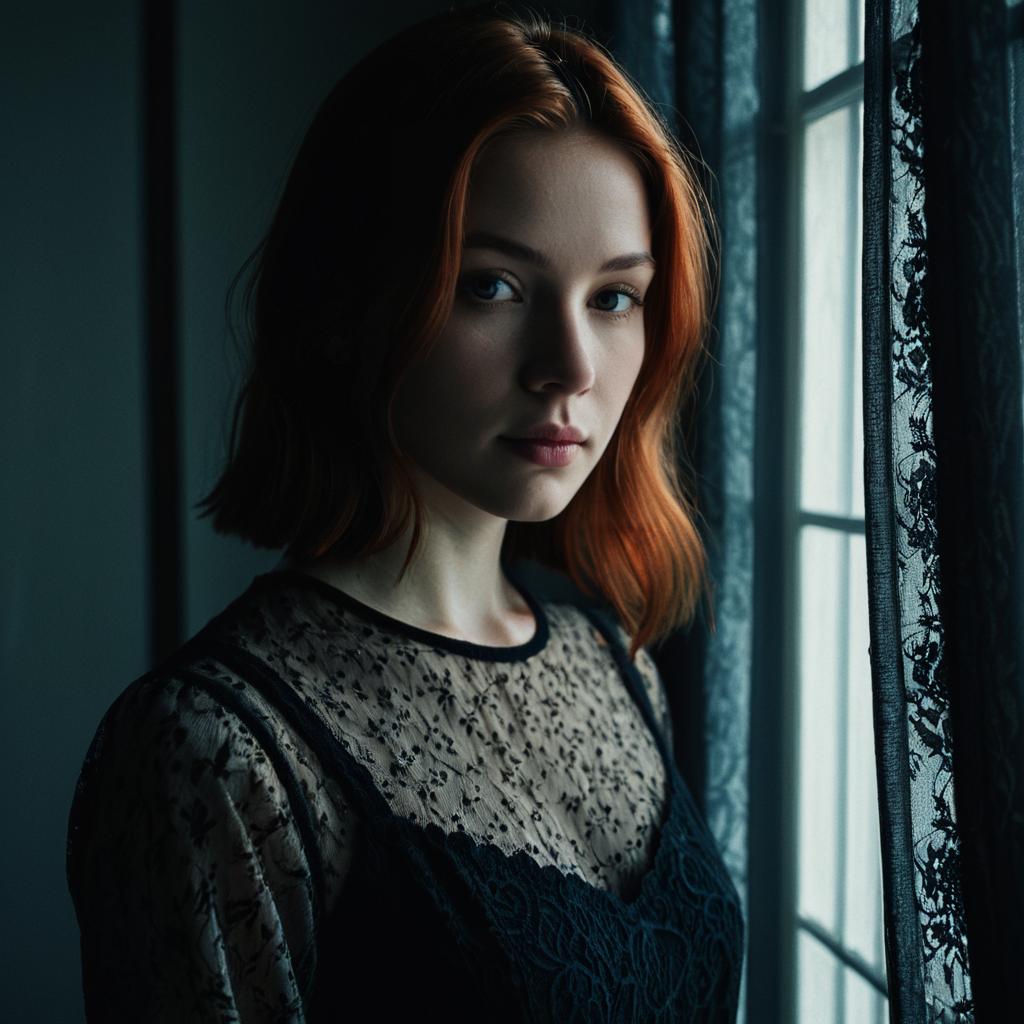 Close-up portrait of a young woman with wavy auburn hair and natural makeup, wearing a red and white patterned dress. She is standing indoors in a softly lit room with deep shadows and a blurred window in the background, creating a moody and cinematic atmosphere.