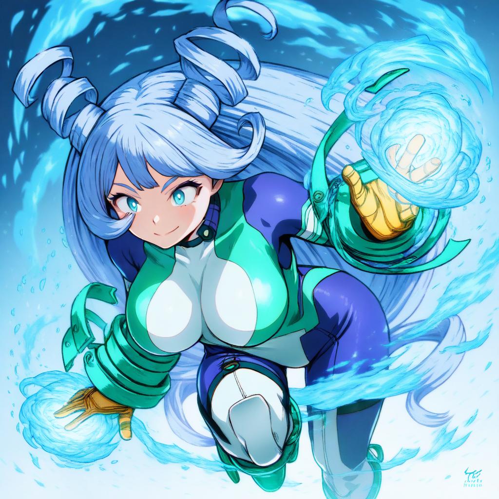 Stylized digital illustration of Hot Pants, a character from JoJo's Bizarre Adventure: Steel Ball Run (SBR). The artwork features Hot Pants with short pink and red hair, bright pink eyes, and a distinct black hat. She is depicted in dynamic motion surrounded by swirling blue and pink energy-like elements. She wears a black top with gold buttons and a beige outfit accented with matching buttons, capturing the anime style by artist Junkpuyo.
