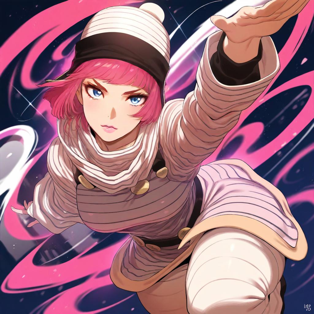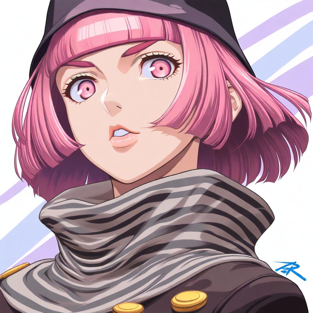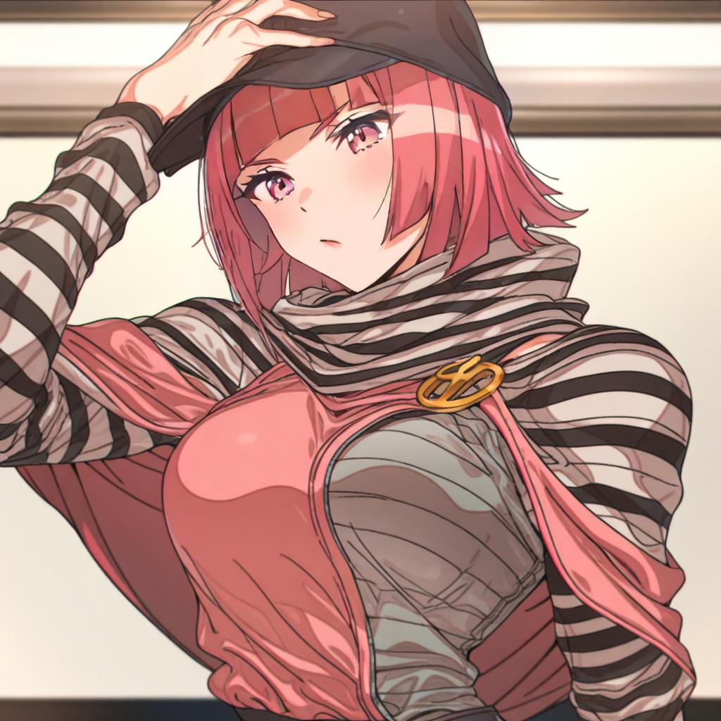 Hot pants (sbr), jojo no kimyou na bouken, 1girl, pink eyes, short hair, pink hair, red hair, hat, by artist junkpuyo, animagine