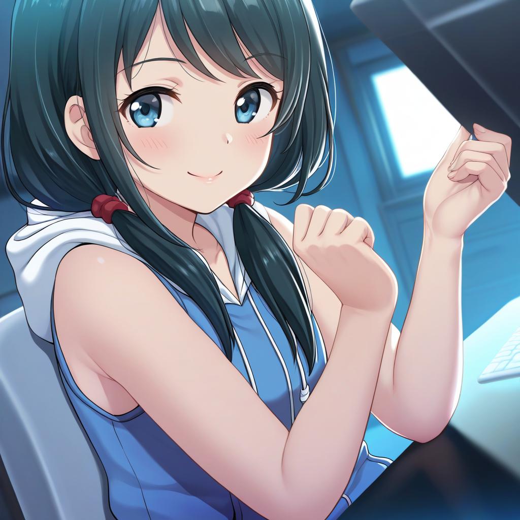 Digital illustration of an anime-style girl with striking blue eyes and long black hair styled in low twintails. She is wearing a sleeveless blue jacket with a white hood down, revealing bare arms. The character has a gentle smile and a soft blush on her cheeks, set against a gradient background.