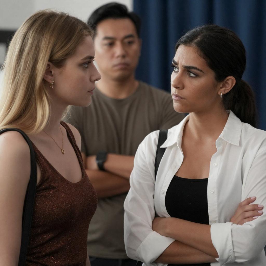 Two women in a laboratory. Blonde woman with white floral blazer, light skin, medium breasts, looking at dark-haired woman. Dark-haired woman with green sweater, light skin, intense expression, smoking cigarette. White microscope between them. Papers and a glass on the table. Background with maps and photos.