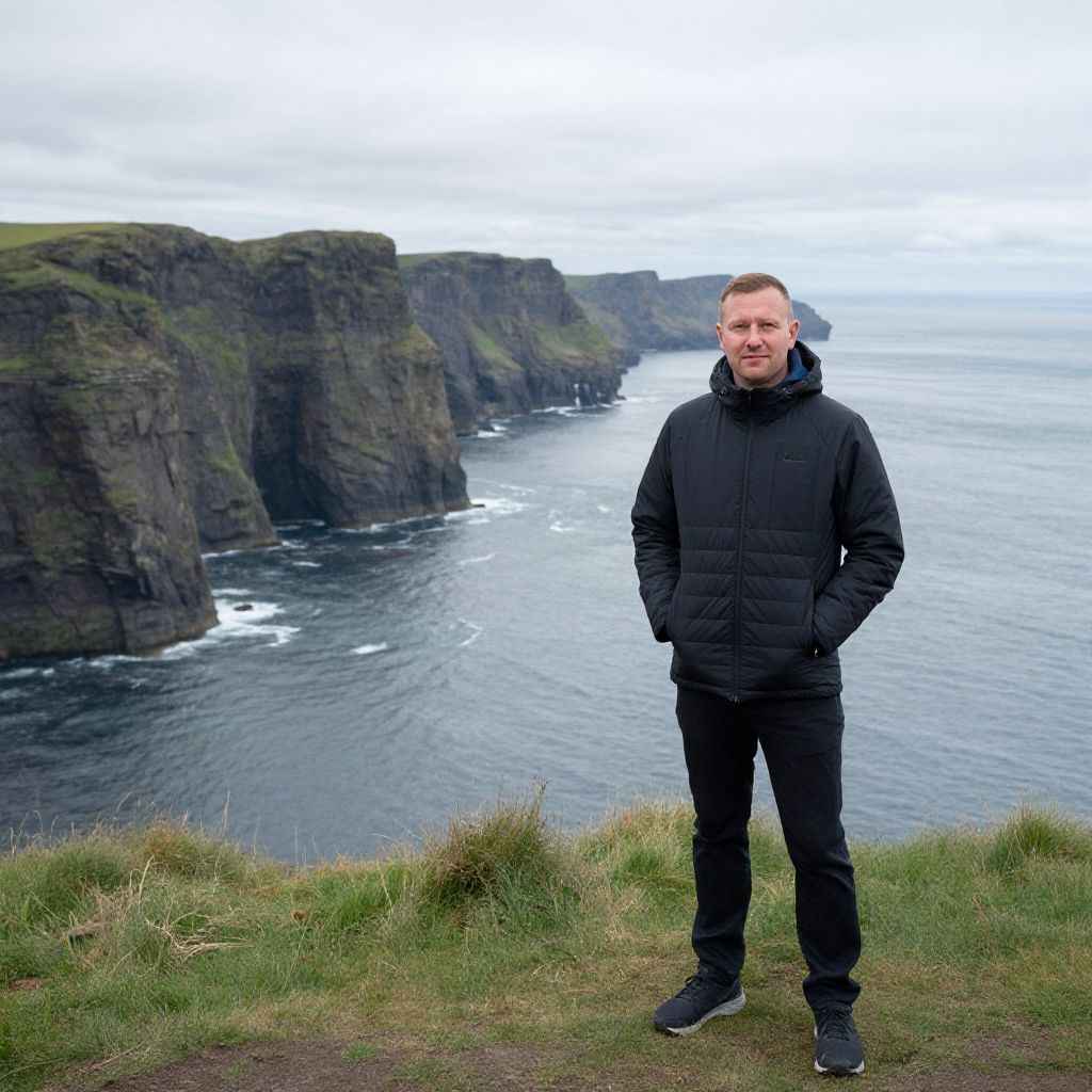 A man stands confidently with the picturesque Irish coastline in the background, epitomizing the serene beauty of Ireland with its dramatic cliffs and expansive ocean.