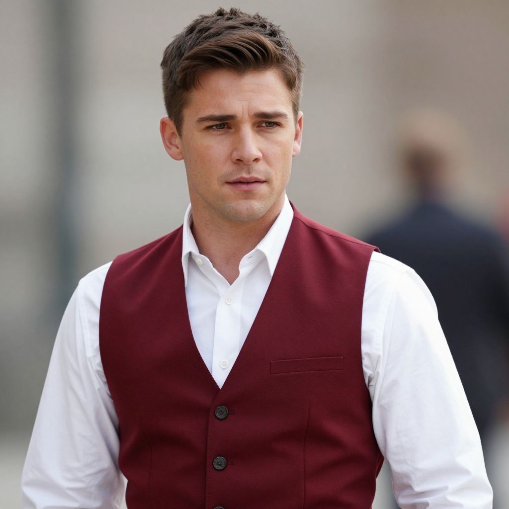 Steve rogers costume, 1boy, male focus, solo, shirt, realistic, buttons, white shirt, vest, manly, jacket, looking at viewer, blurry background, closed mouth, upper body, blurry, red vest, brown hair