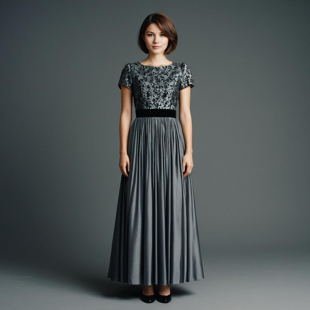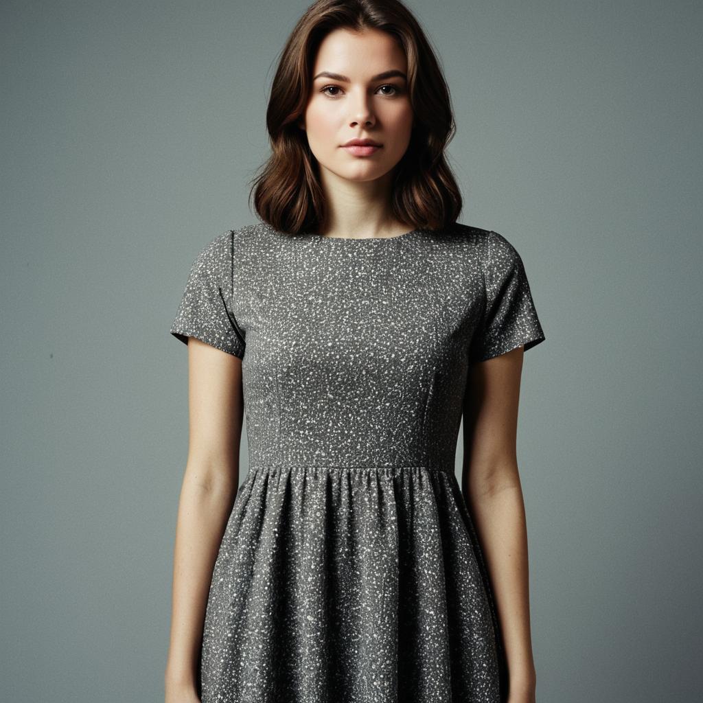 British icon dress,1girl, solo, realistic, dress, looking at viewer, brown hair, grey dress, short sleeves, arms at sides, closed mouth, standing, simple background, lips