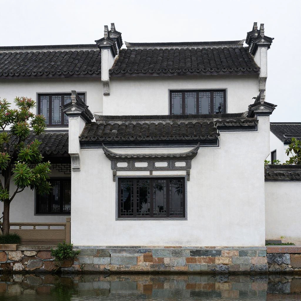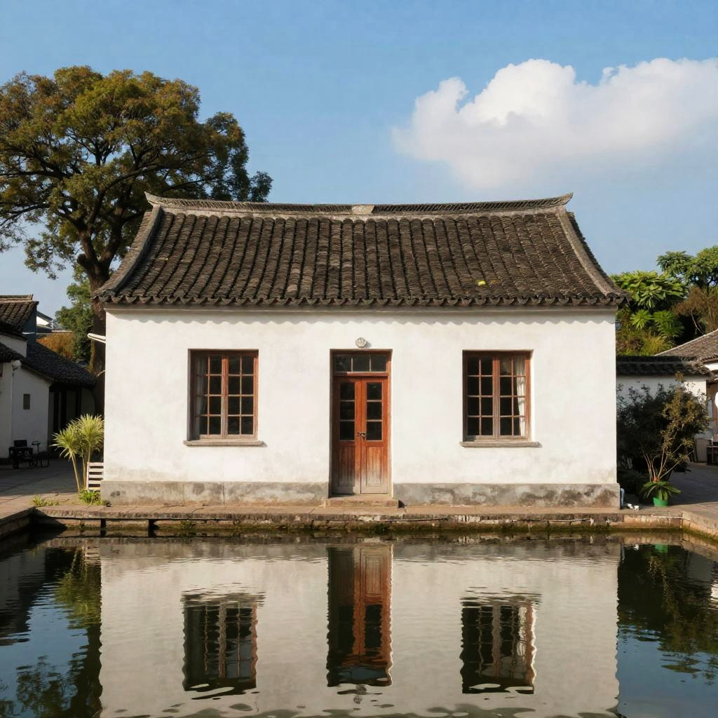 Zhuai_rural architecture, new chinese style, residential group perspective, residential group, water surface, scenery, tree, building, outdoors, window, reflection, water, plant, best quality, realistic, photorealistic, ultra detailed, 8K, High quality texture, intricate details, detailed texture, finely detailed, RAW photo, photo of building, (high detailed skin:1.2), uhd, dslr, soft lighting, high quality, film grain