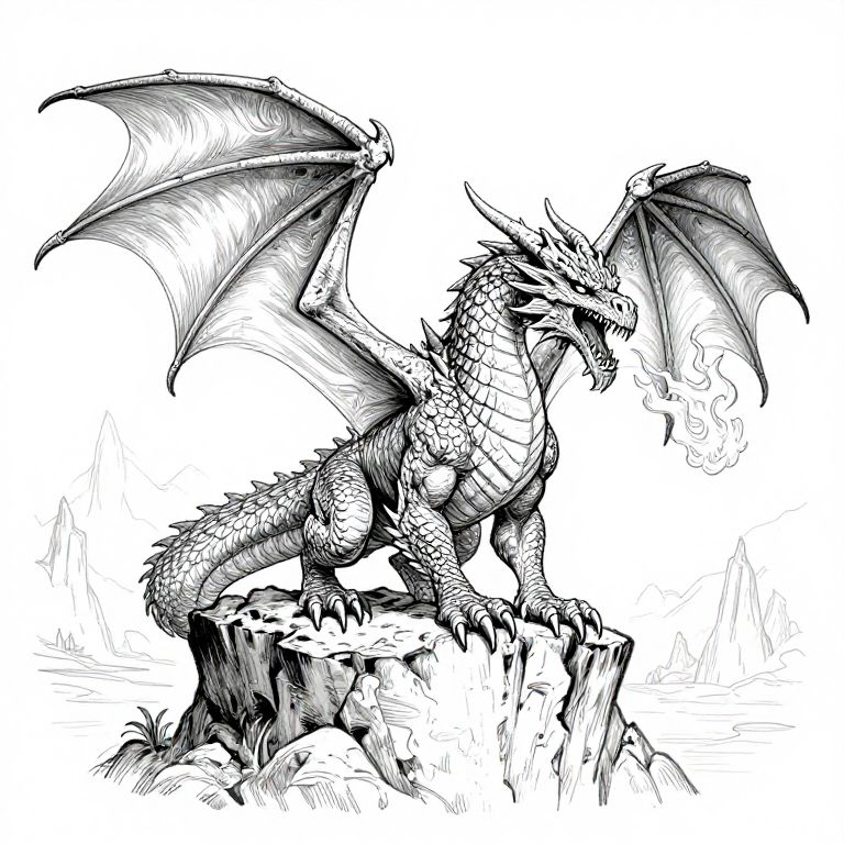 Dragon lineart of a fierce western dragon perched on a cliff, wings unfurled and flames curling from its mouth, detailed linework emphasizing texture of scales and muscles, dynamic pose with a fantasy landscape hinted in minimalist strokes.