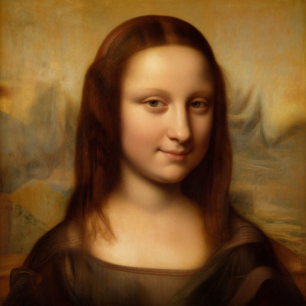 Digital art mashup of Leonardo da Vinci's "Mona Lisa" with a modern young girl, brown hair, soft smile, and brown dress.