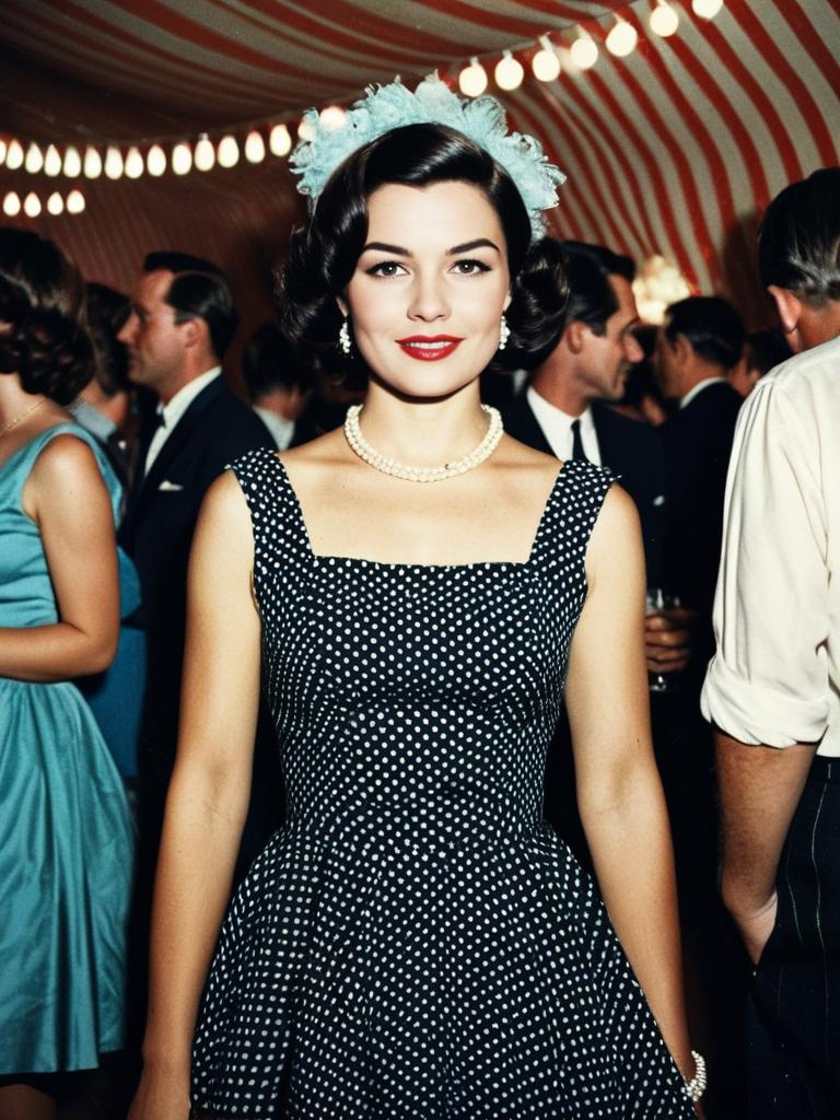 Photorealistic portrait of a woman wearing a vintage black and white polka dot dress, pearl necklace, and matching earrings at a retro-themed party. The woman has styled dark hair with a light blue hair accessory, red lipstick, and is standing in a festive environment with blurred guests in formal attire and decorative string lights in the background.
