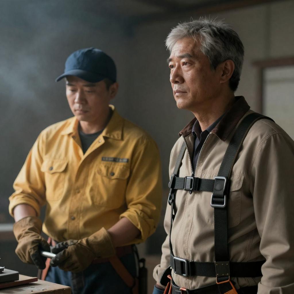 Photo of an Asian man wearing a beige jacket and gloves, crouching inside a dark rocky cave. Bright sunlight streams through an opening behind him, illuminating the scene. The man holds a metal tool and is positioned near a wire basket on the cave floor.