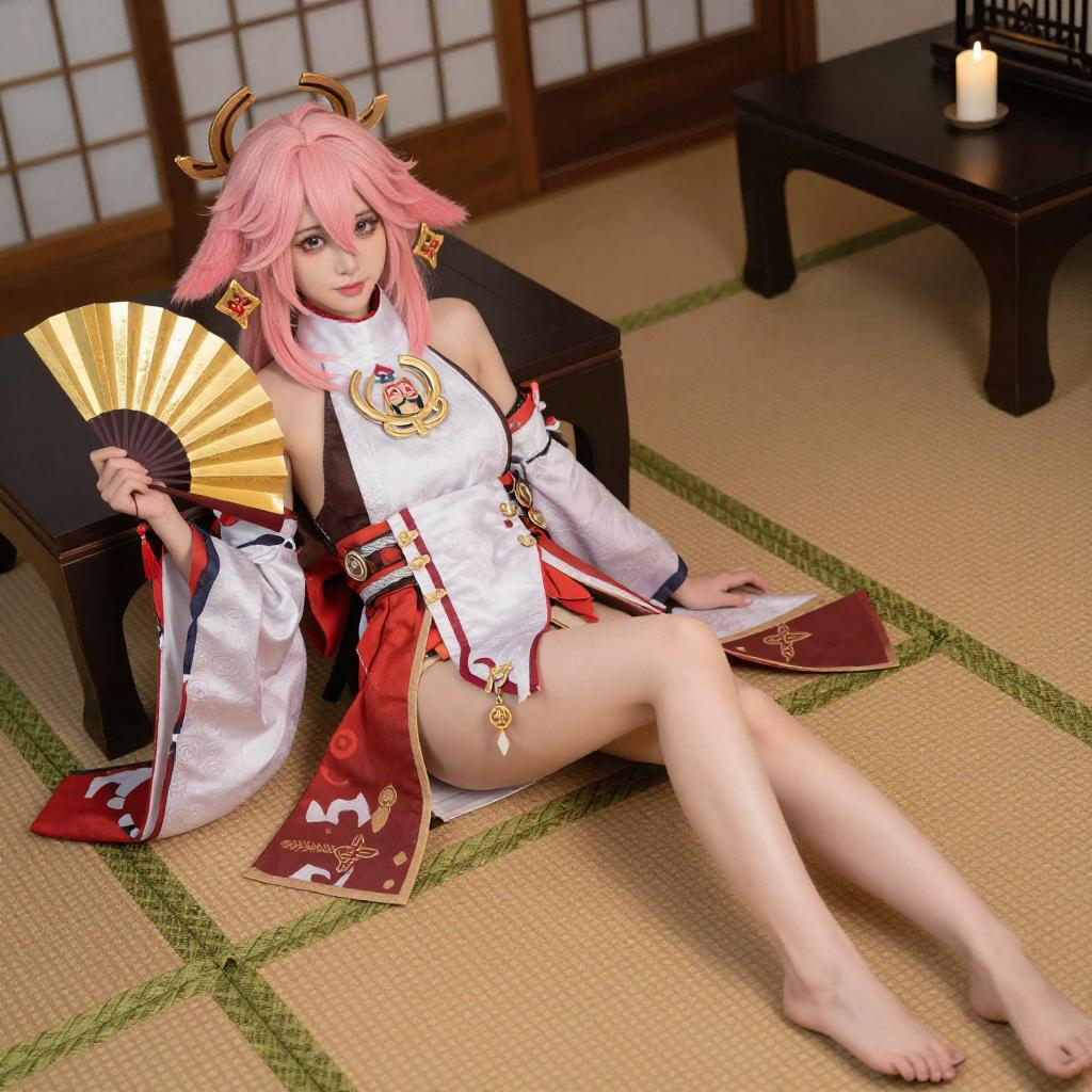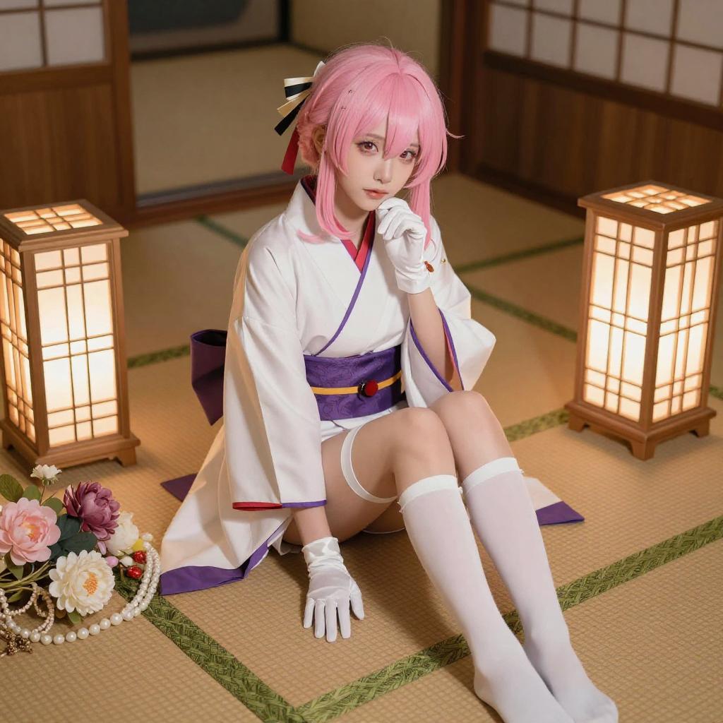 Digital anime-style image of a pink-haired girl with white and purple kimono, white thigh-high socks, and white gloves, sitting on a tatami mat floor. She's near two glowing lanterns, with a floral arrangement and beads beside her. She gazes forward with a thoughtful expression, her hair adorned with a ribbon.