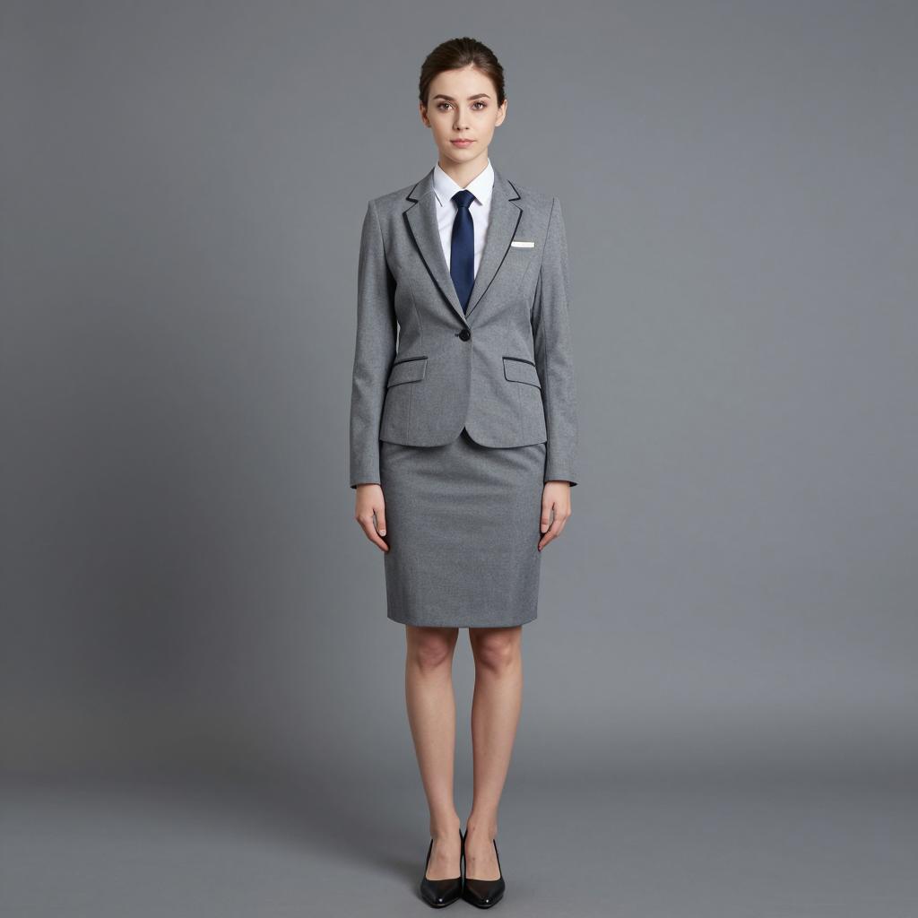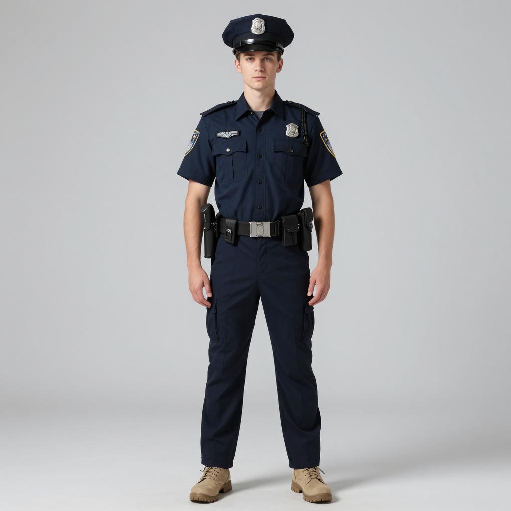 A young woman wearing a dark blue naval officer uniform with white short sleeves, black pants, and a matching navy cap featuring a gold emblem. She stands in a profile pose facing left with a serious expression, her light brown hair neatly tied back. The photo is a full-body shot against a plain beige background with soft lighting, conveying a calm and professional atmosphere.