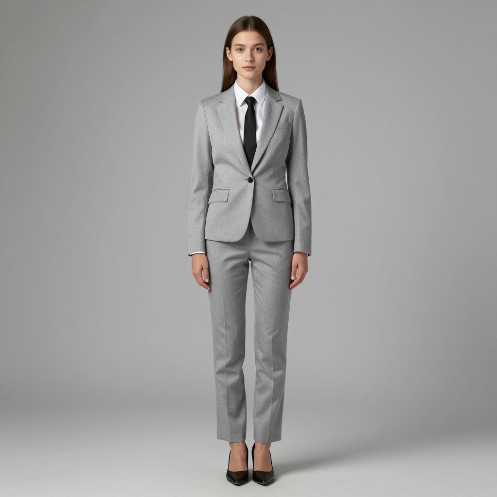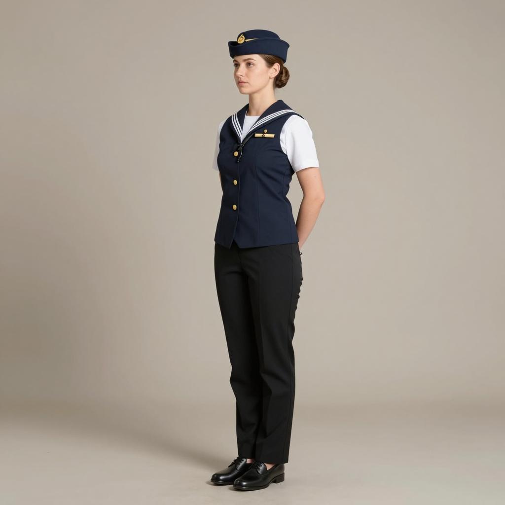Navy costume female, photograph of a young woman in a naval officer uniform, standing in profile, facing left, hands in pockets, serious expression, dark blue navy uniform with white sleeves, black pants, navy cap with gold emblem, light brown hair tied back, plain beige background, soft lighting, realistic style, full-body shot, slight shadow behind, calm and professional atmosphere