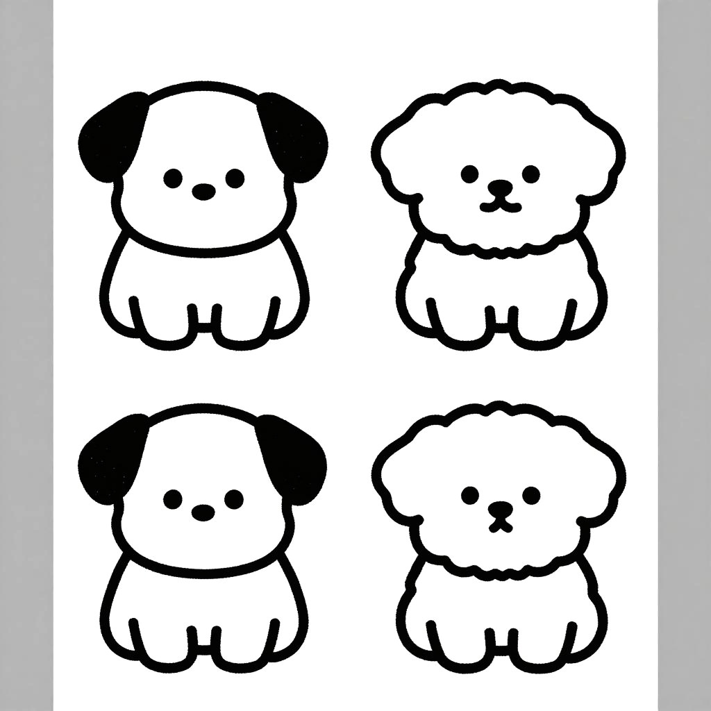 Black and white digital drawing of four cute, simple, cartoon-style dogs with round bodies, small ears, and minimalistic features.