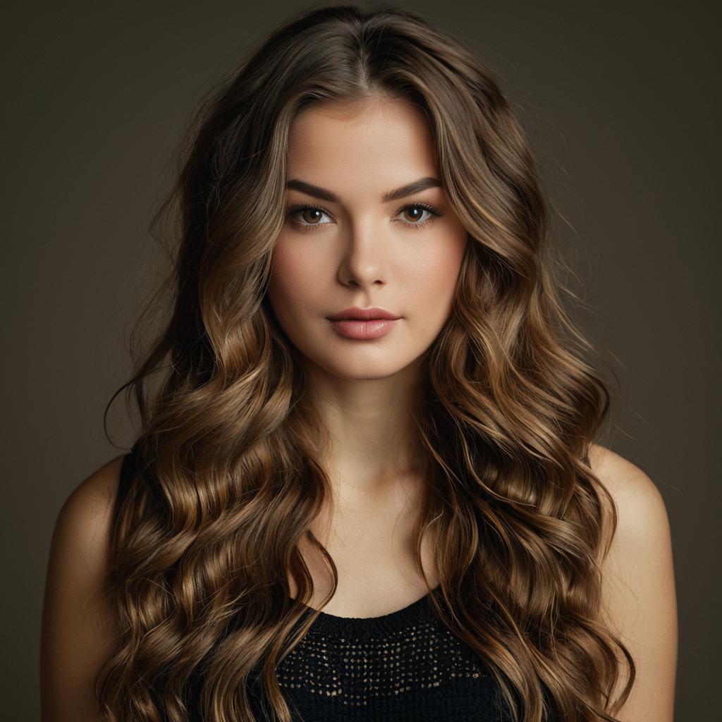 Very long wig hair, hyper-realistic digital portrait of a young woman, 70s style voluminous brown hair with blonde highlights, green eyes, fair skin, wearing a blue V-neck shirt with a gold necklace, soft lighting, blurred dark background, detailed hair ure, subtle makeup, centered, frontal view, high quality, photorealistic, soft focus, classic beauty, feminine, nostalgic vibe