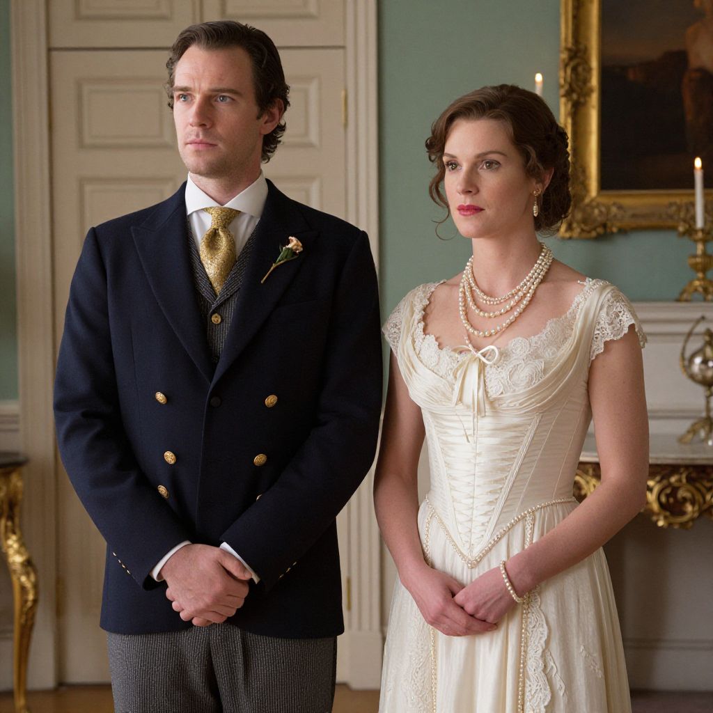 Elegantly dressed couple standing side by side in a luxurious interior, the man in a navy suit with gold accents and a boutonniere, and the woman in a cream corset dress adorned with lace details and pearl jewelry, exuding timeless sophistication reminiscent of Downton Abbey's iconic style.