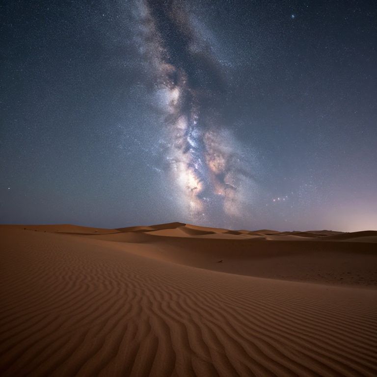 A serene desert landscape bathed in the ethereal glow of a star-studded sky, where the Milky Way cascades like liquid light over rippling dunes, defying the boundaries between earth and cosmos.