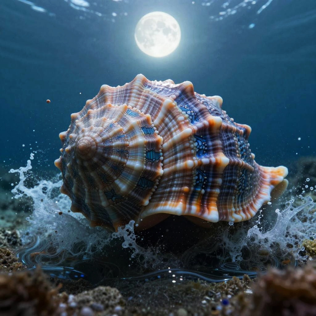 Omastar, ancient spiral-shelled sea creature, emerging from deep ocean waters under a glowing moonlight, intricate details on the shell, vibrant underwater colors, dynamic waves crashing around, mystic fantasy style, highly detailed, dramatic lighting
