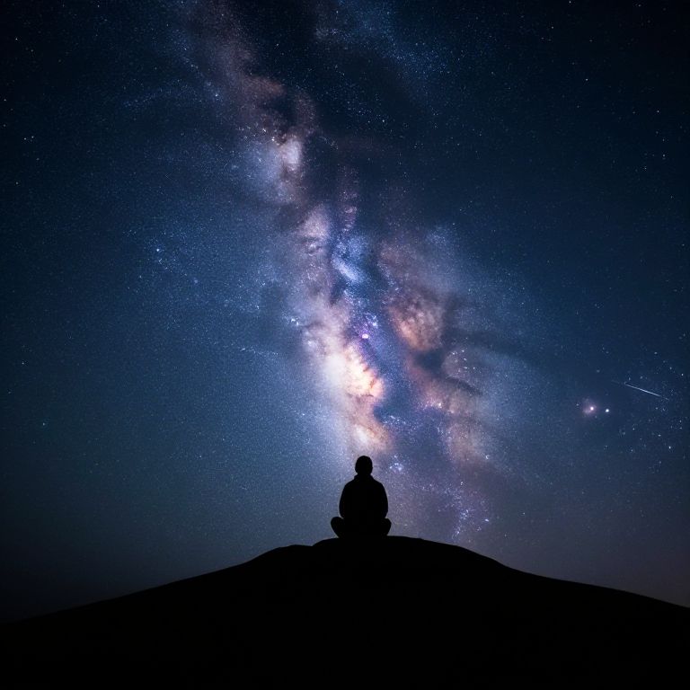 Photograph of a person silhouetted against a stunning night sky, sitting on a hilltop. The Milky Way galaxy stretches across the sky, with vibrant blue, white, and pink hues. Stars are scattered throughout the dark, deep blue background. The person, in a seated posture, is centered at the bottom, creating a strong contrast with the bright, colorful galaxy above. The hill is a dark, shadowy shape beneath the person. The image evokes a sense of awe and tranquility, capturing the beauty of the night sky and the solitary, contemplative figure.