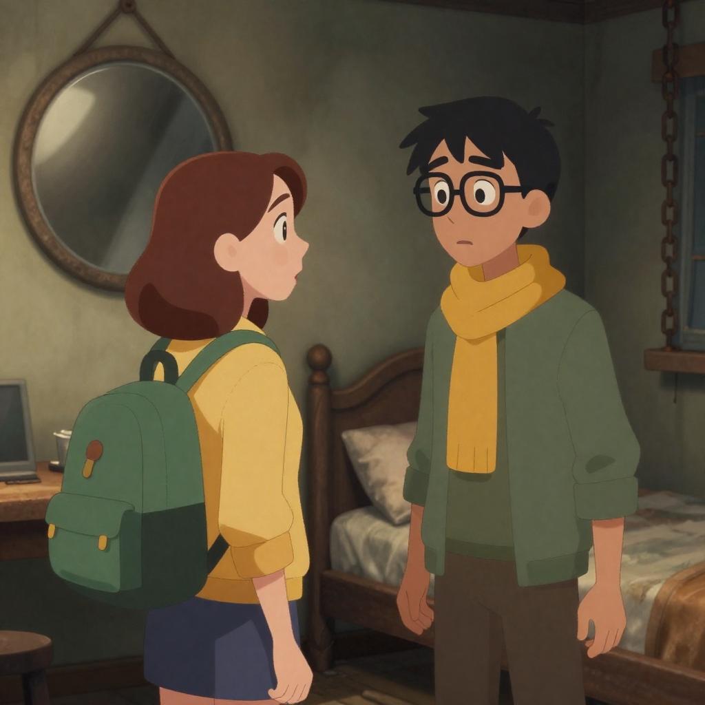 Digital illustration of three children standing on a snow-covered rooftop at night. Blue-toned scene, children in winter clothes, two on left and one on right, dark sky background, foggy foreground.