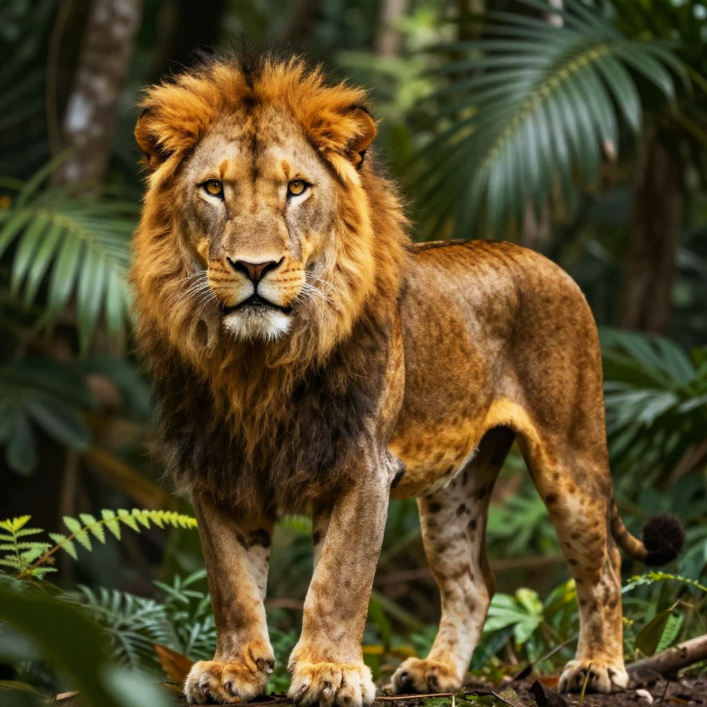 Lion jaguar hybrid creature standing majestically in a dense jungle, golden fur blended with dark rosettes, piercing amber eyes, powerful muscular build, realistic wildlife art style, vibrant colors, early morning light filtering through lush green foliage