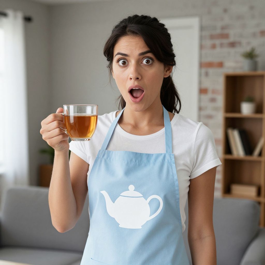 Photograph of a surprised young woman with dark hair, wearing a white t-shirt and light blue apron with a white tea kettle graphic, holding a glass of amber-colored tea in her right hand. Her mouth is open in shock, eyes wide. Background features a gray sofa, white curtain, and brick wall with wooden shelves. The image has a humorous, exaggerated expression style, with a slight digital enhancement effect. Lighting is natural, coming from the left.