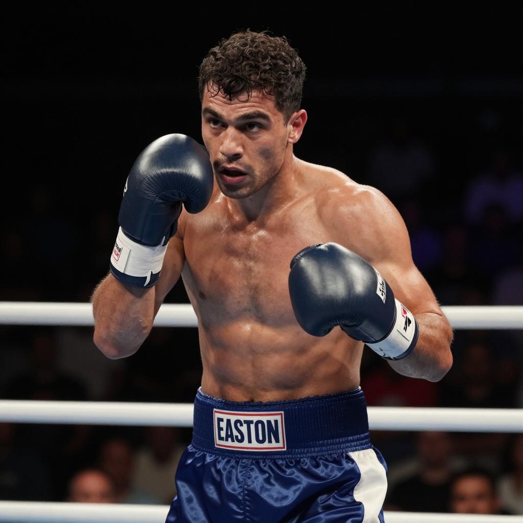 Muscular, shirtless male boxer with dark curly hair wearing red boxing gloves and white shorts, draped in the British flag. He is being hugged and supported from behind by his trainer, both showing intense expressions, set against a dark background.