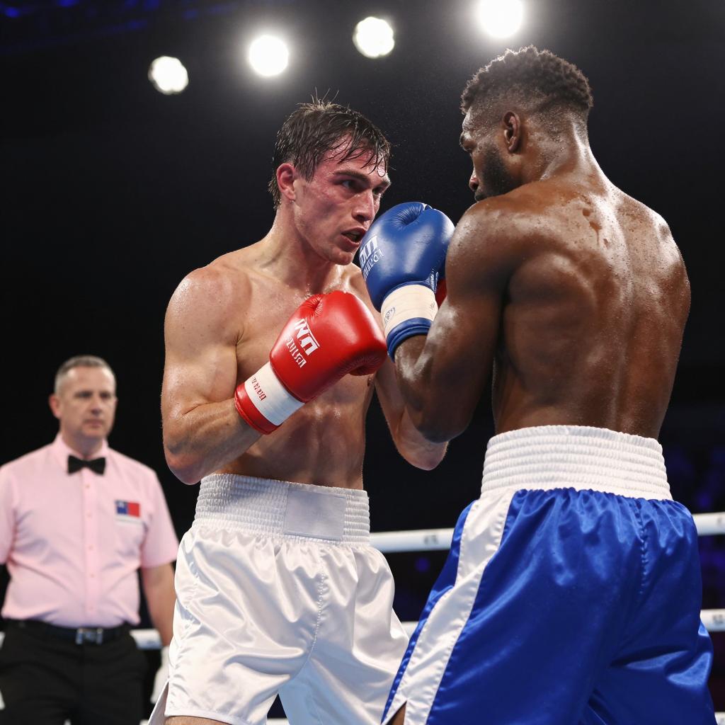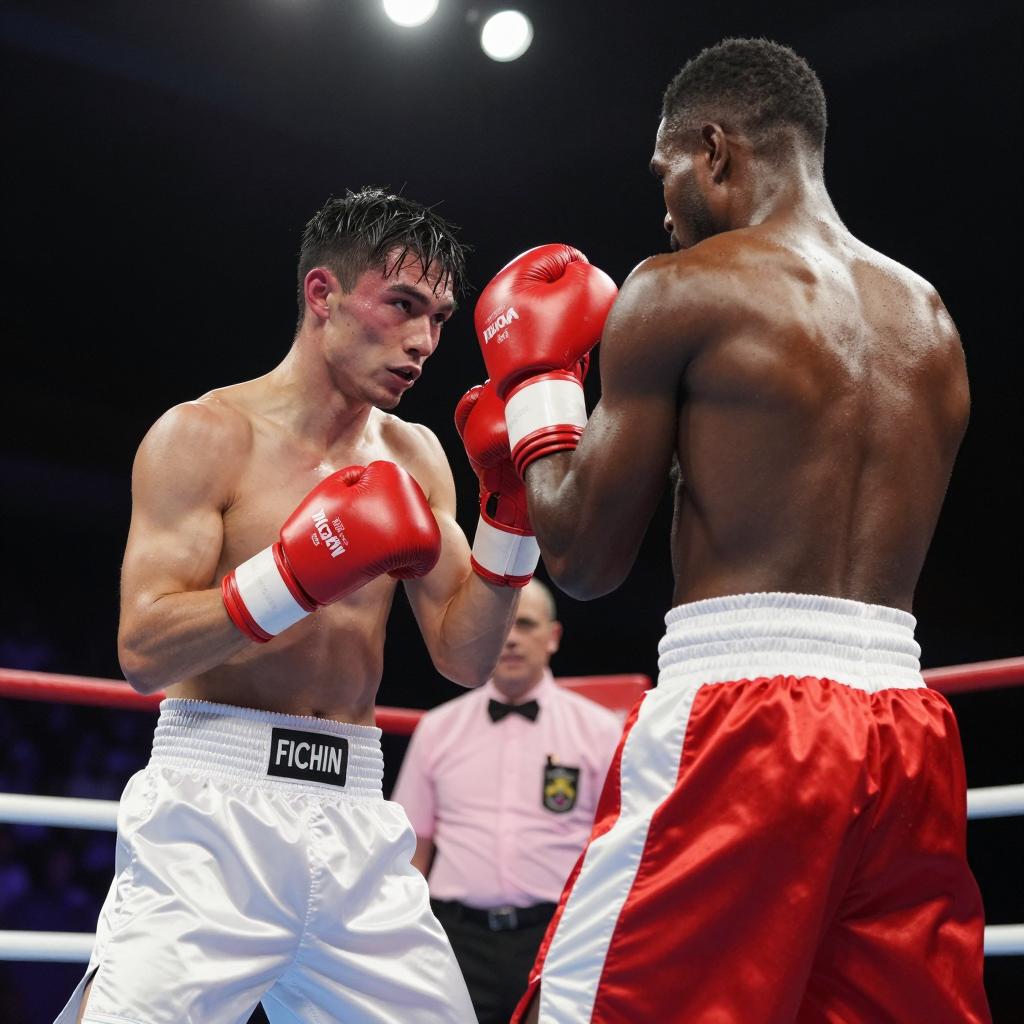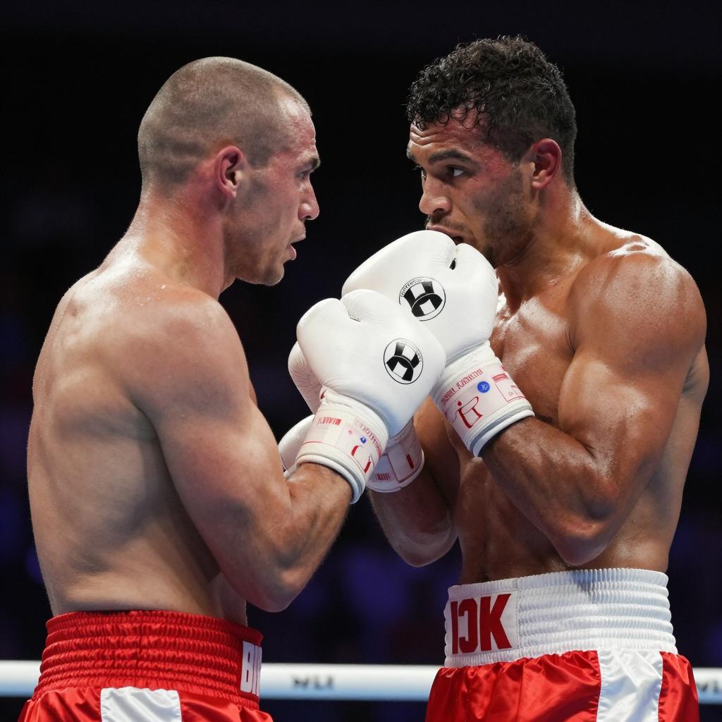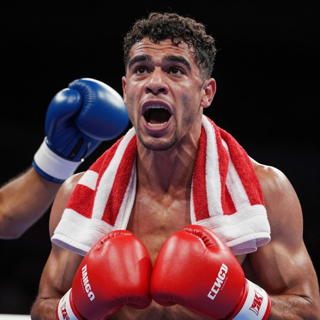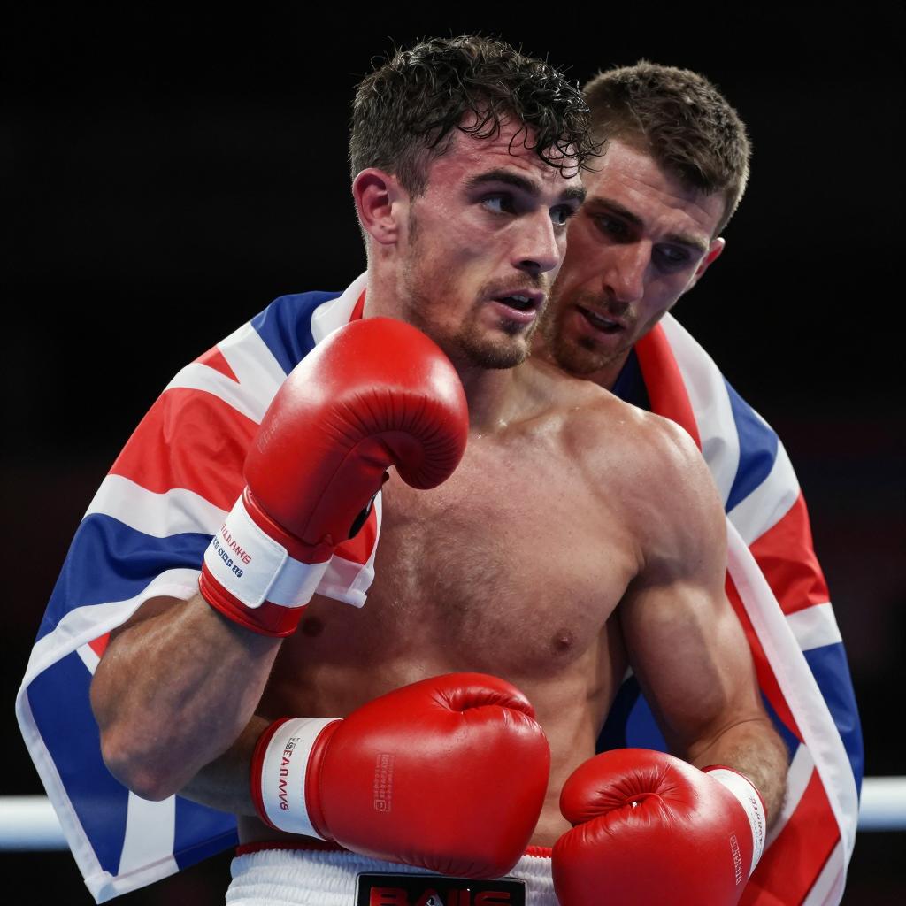 Photograph of a muscular, shirtless male boxer with dark, curly hair, wearing red gloves and a red and white robe. He is being hugged from behind by another person, both with intense expressions. British flag draped over his shoulders. Dark background.