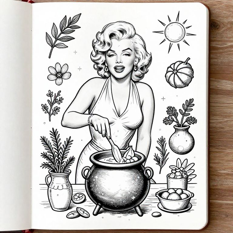 "Marilyn Monroe A beautiful witch brewing a potion in her cauldron, surrounded by herbs and magical ingredients, COLORING BOOk PAGE, balck and white outline, REAILISTIC,"