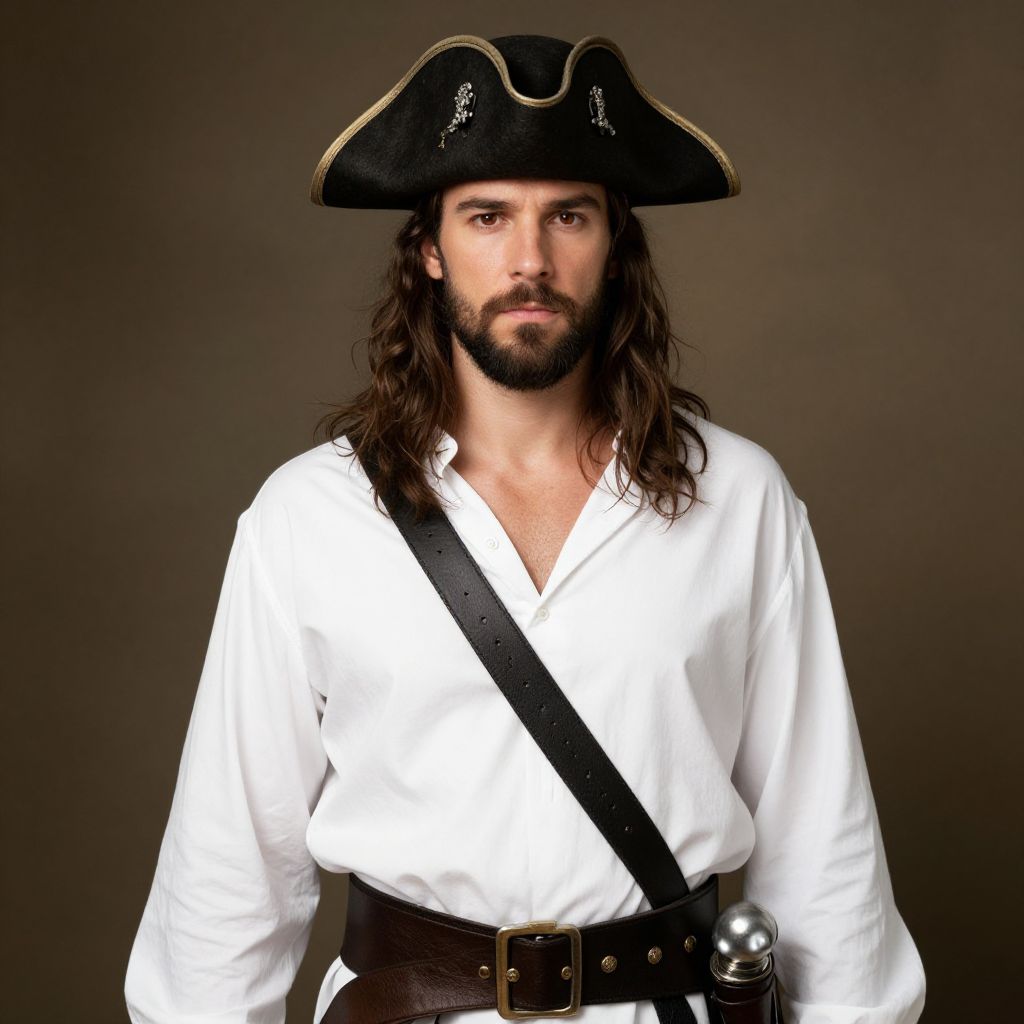 Rum captain male costume, 1boy, male focus, solo, hat, facial hair, beard, belt, looking at viewer, shirt, white shirt, pirate hat, upper body, realistic, weapon, bicorne