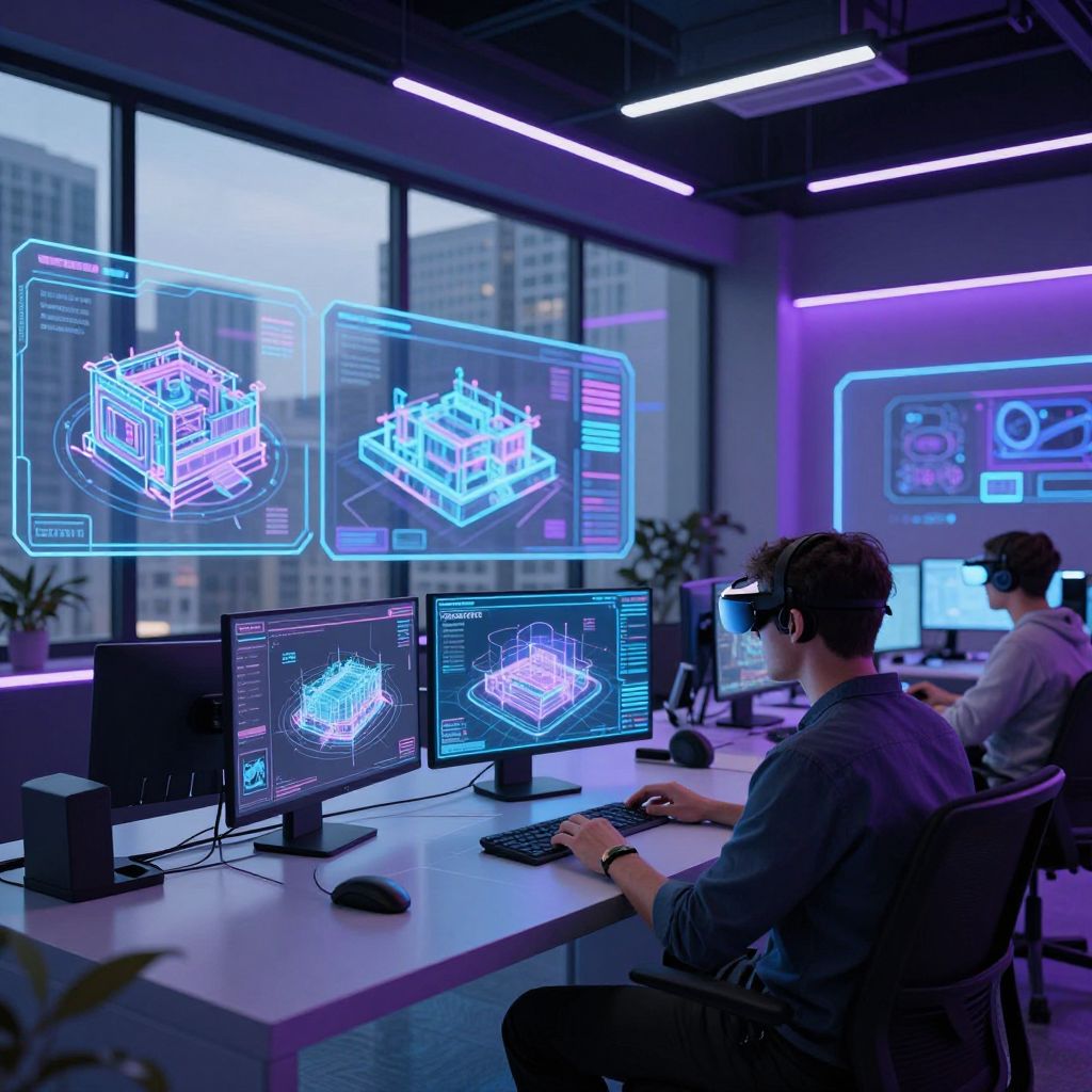 DesignLab concept art showing cutting-edge virtual reality design environment, holographic screens displaying 3D models, neon blue and purple lighting, modern urban studio with panoramic windows, focused designers experimenting with digital art and architecture.