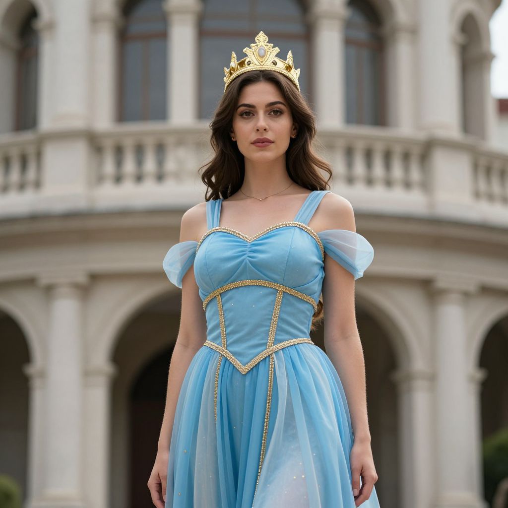 Goddess costume, a woman in a blue dress and gold crown standing in front of a building