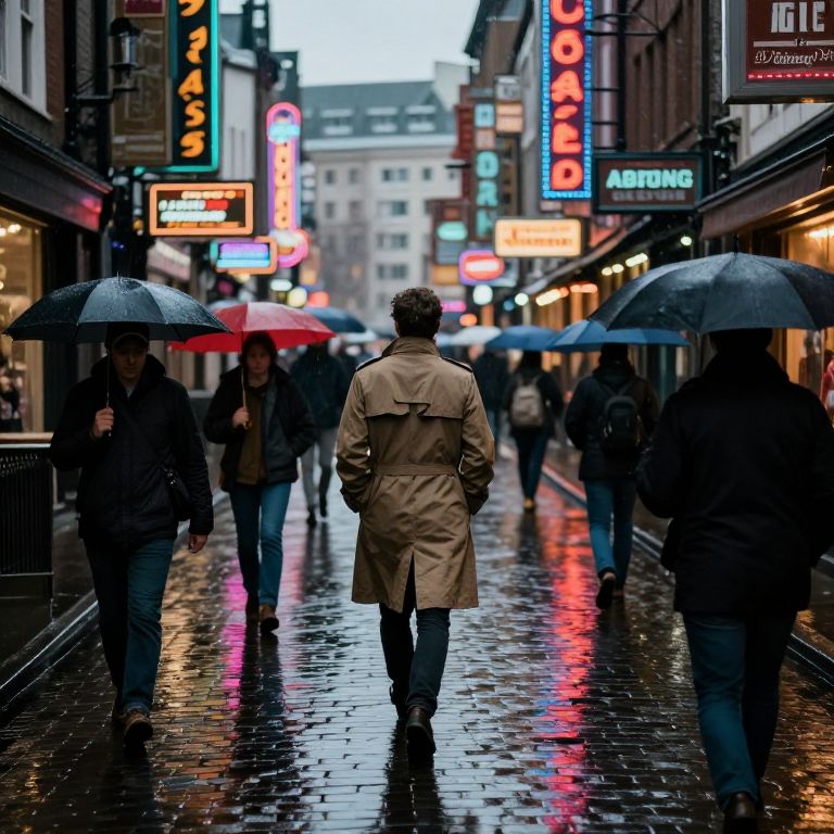 Walked in a bustling vintage city street, rain-soaked cobblestone pavement reflecting colorful neon signs, people with umbrellas moving hurriedly, a solitary figure in a trench coat walking purposefully, moody noir aesthetic, rich atmospheric depth
