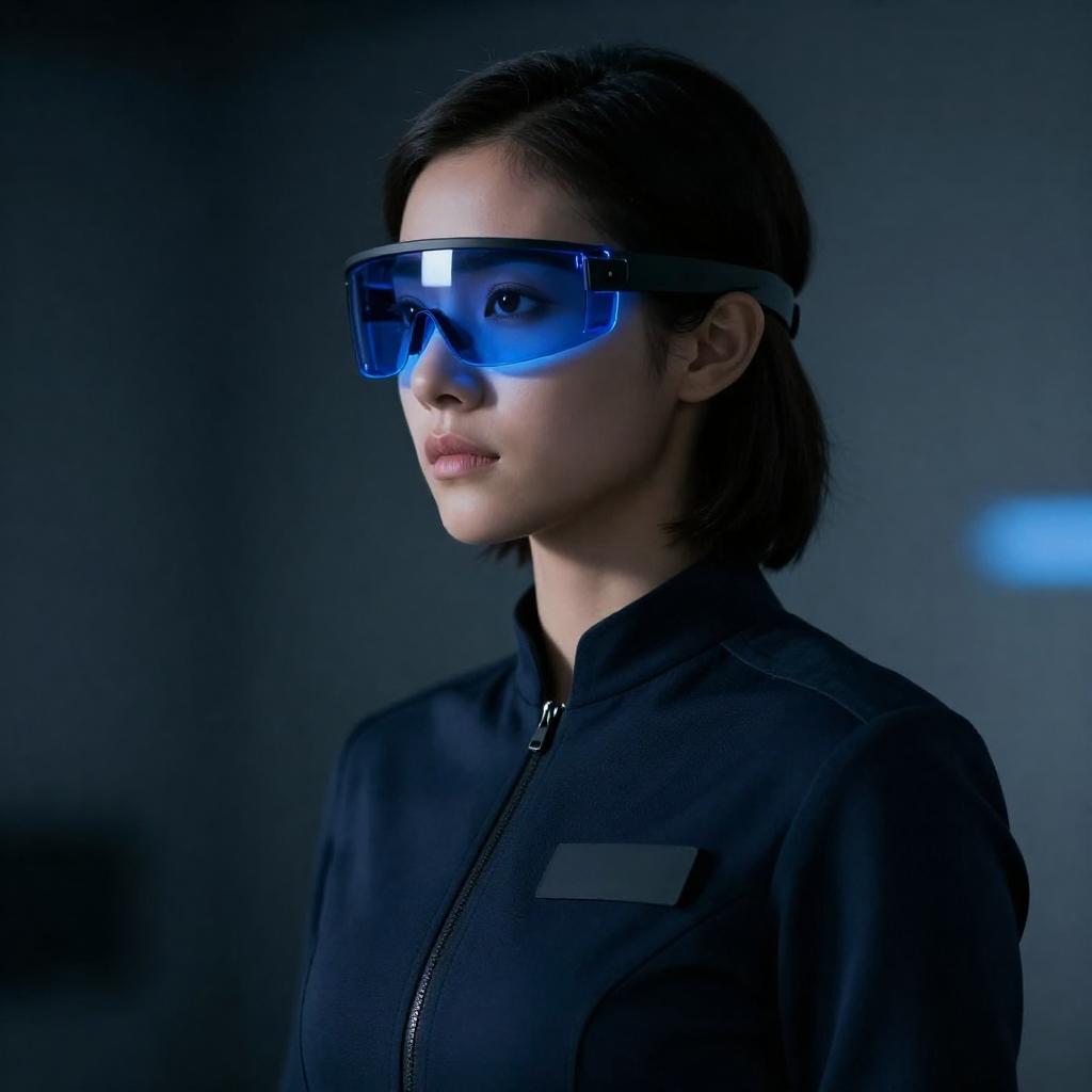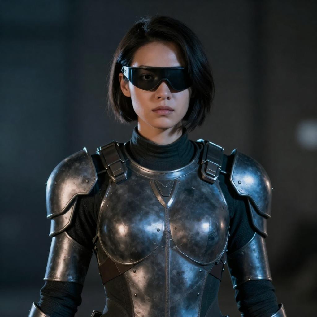 Photograph of a woman with short, dark hair, wearing a metallic, armored suit with shoulder pads, illuminated by blue lighting. Her expression is serious, and she stands against a dark, blurred background. The armor has a ured, worn appearance, and her right eye is visible, while the left eye is obscured by a dark visor.