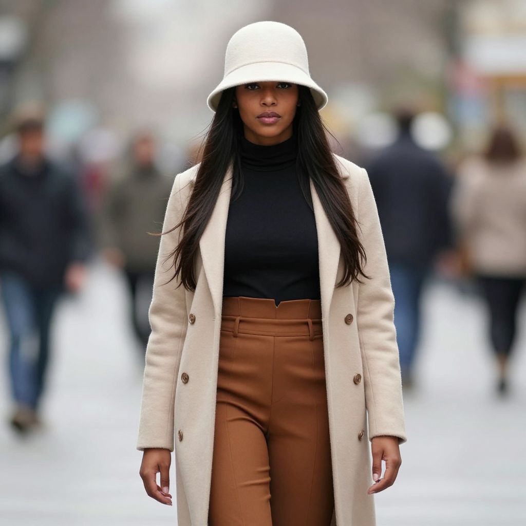 Dionne clueless hat costume, 1girl, hat, pants, coat, long hair, high-waist pants, looking at viewer, solo focus, dark skin, solo, lips, turtleneck, dark-skinned female, outdoors, blurry, blurry background, realistic
