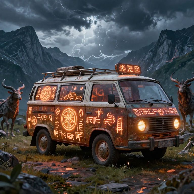 Photograph of a vintage van with glowing, ancient runes and symbols, parked in a stormy, mountainous landscape with yak-like creatures.