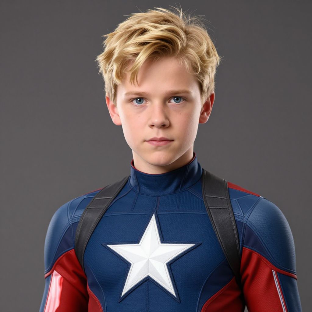 Boy avengers costume, solo, realistic, male focus, 1boy, animification, blonde hair, blue eyes, superhero, aged down, star (symbol)