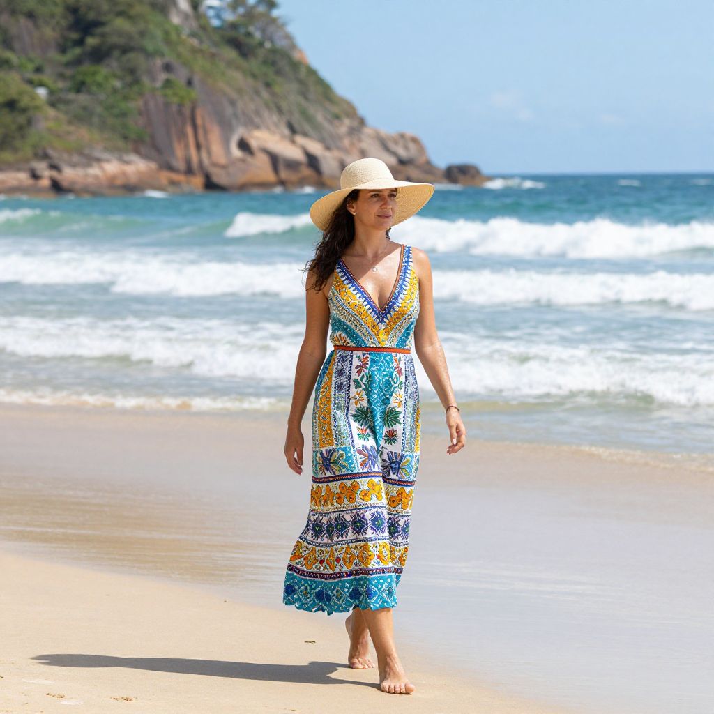 Woman strolling along a pristine beach in Maragogi, Brazil, wearing a vibrant Blessinha dress and wide-brimmed straw hat, with turquoise ocean waves and rocky cliffs in the background.