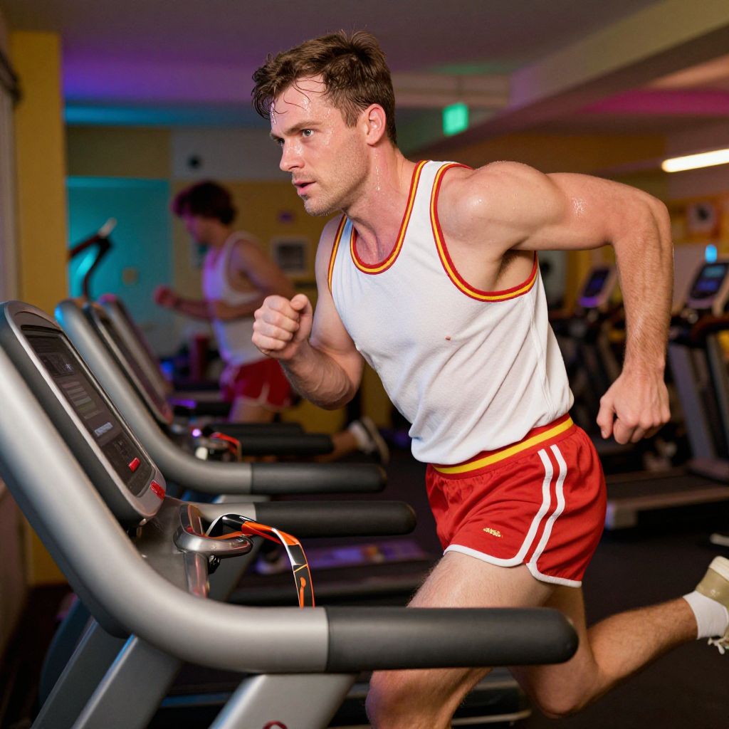 Vibrant anscocrome hues illuminate the scene as a man runs swiftly on a vintage style treadmill, sweat dripping from his brow, muscles flexing beneath his retro athletic wear. The camera captures the kinetic energy of his movement, blurring the background into a kaleidoscope of colors, evoking nostalgia for a bygone era. Man has masculine face and piercing eyes