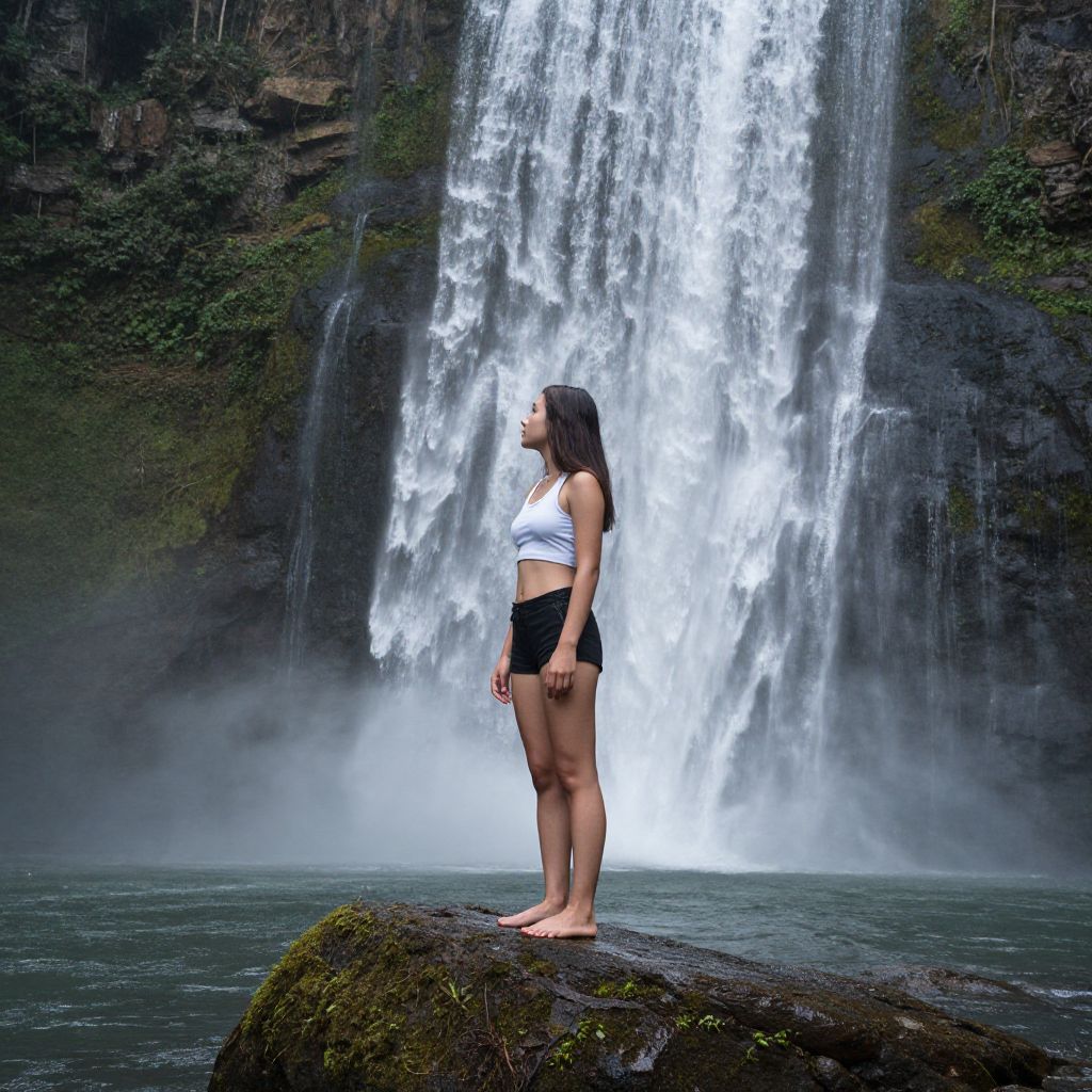 Photograph of a woman with long black hair in a white bikini top and blue denim shorts, standing on a dirt path, overlooking a coastal landscape with